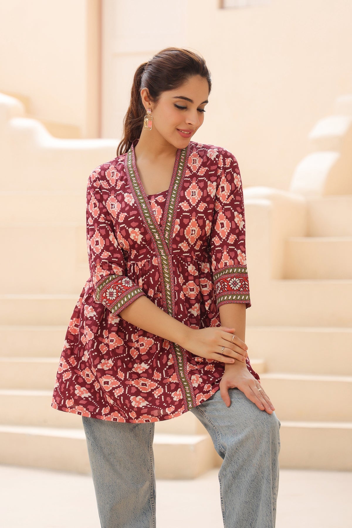 This is a wine abstract printed A-line kurti, V-Neck kurti with three-quarter sleeves and mirror work detailing.