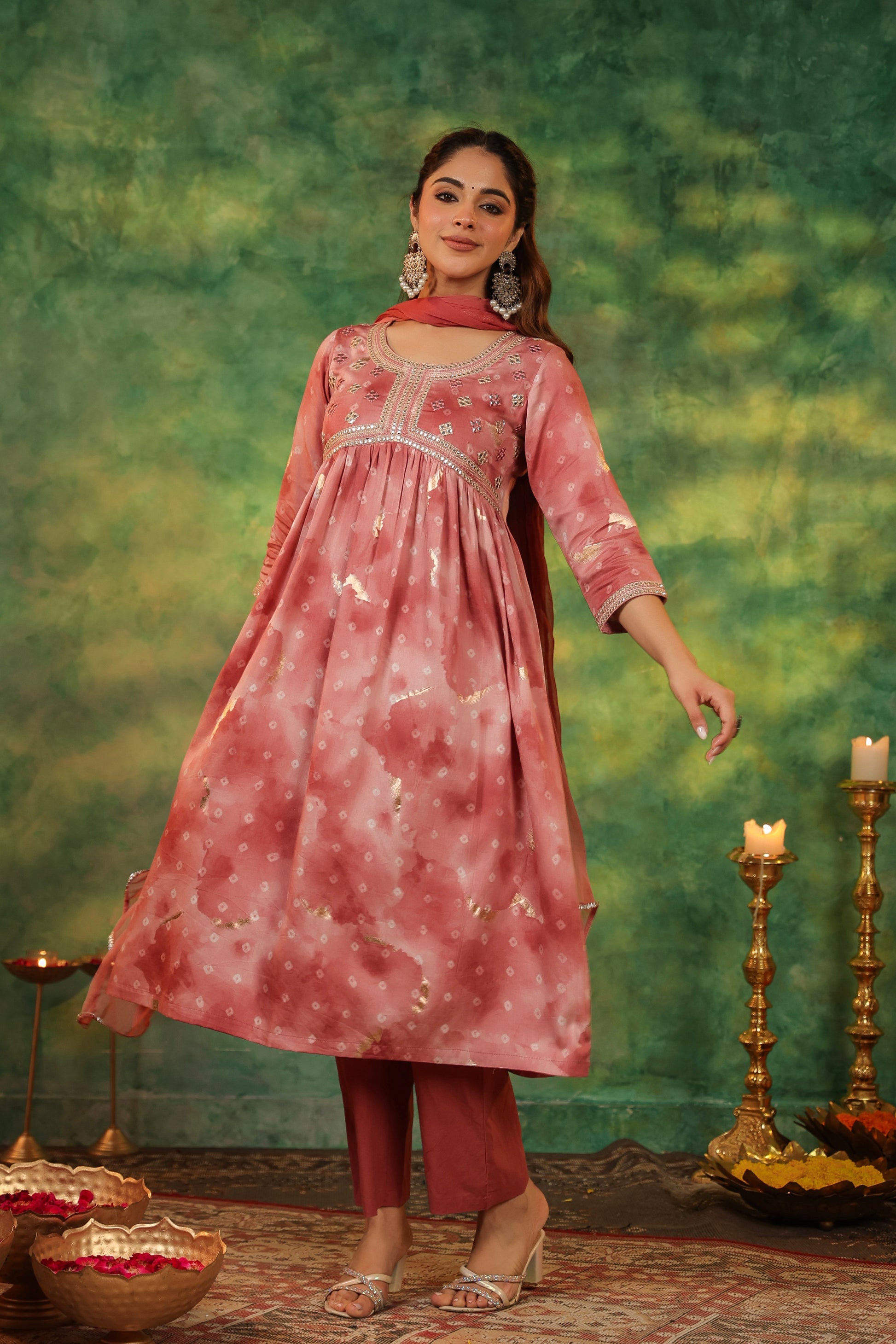 Bandhani Printed Pure Cotton Anarkali Kurta With Trousers & Dupatta