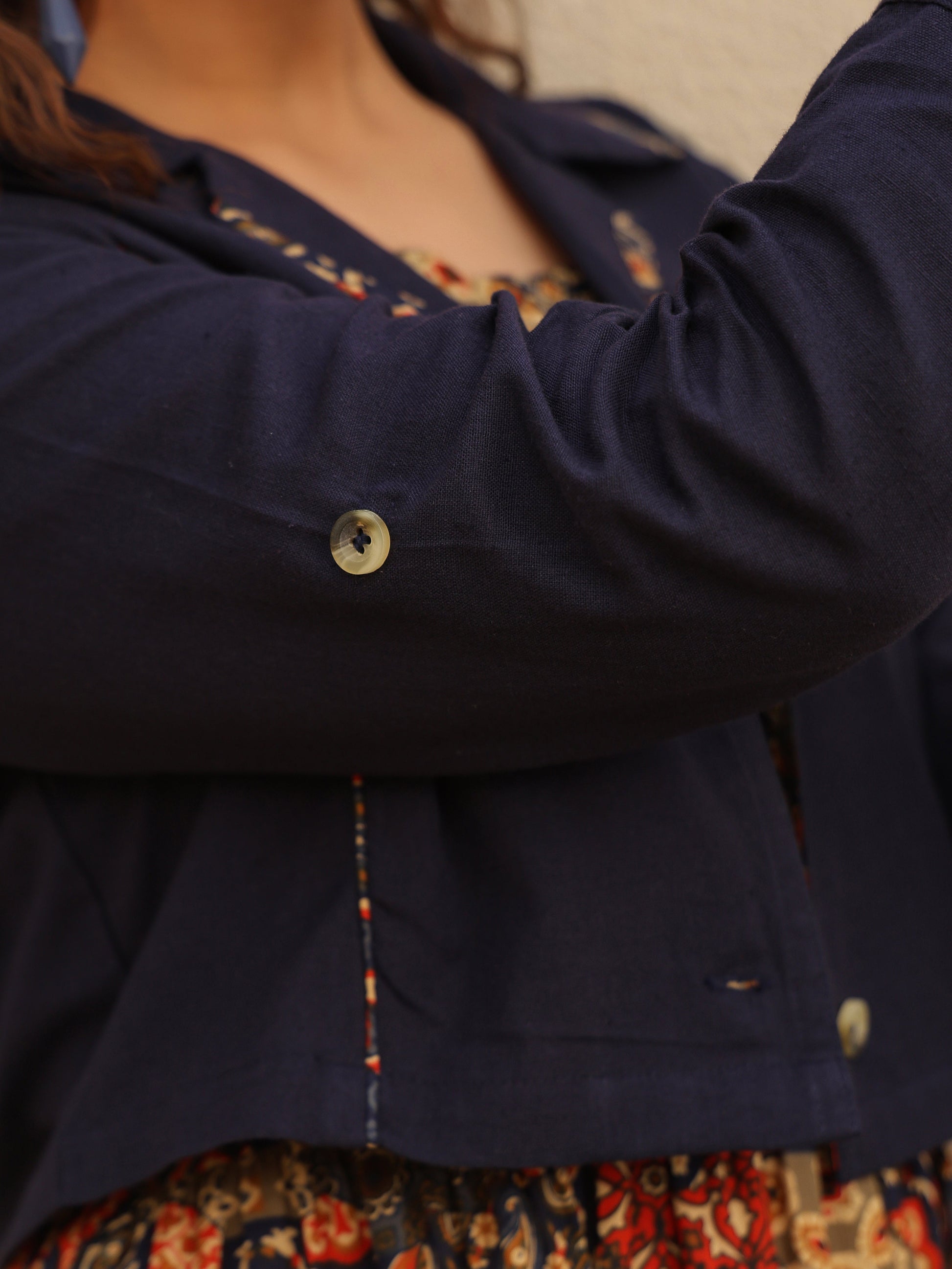 This is a multi color ethnic motifs printed dress, sleeveless tiered dress with blue solid jacket, fit and flare dress with pocket.