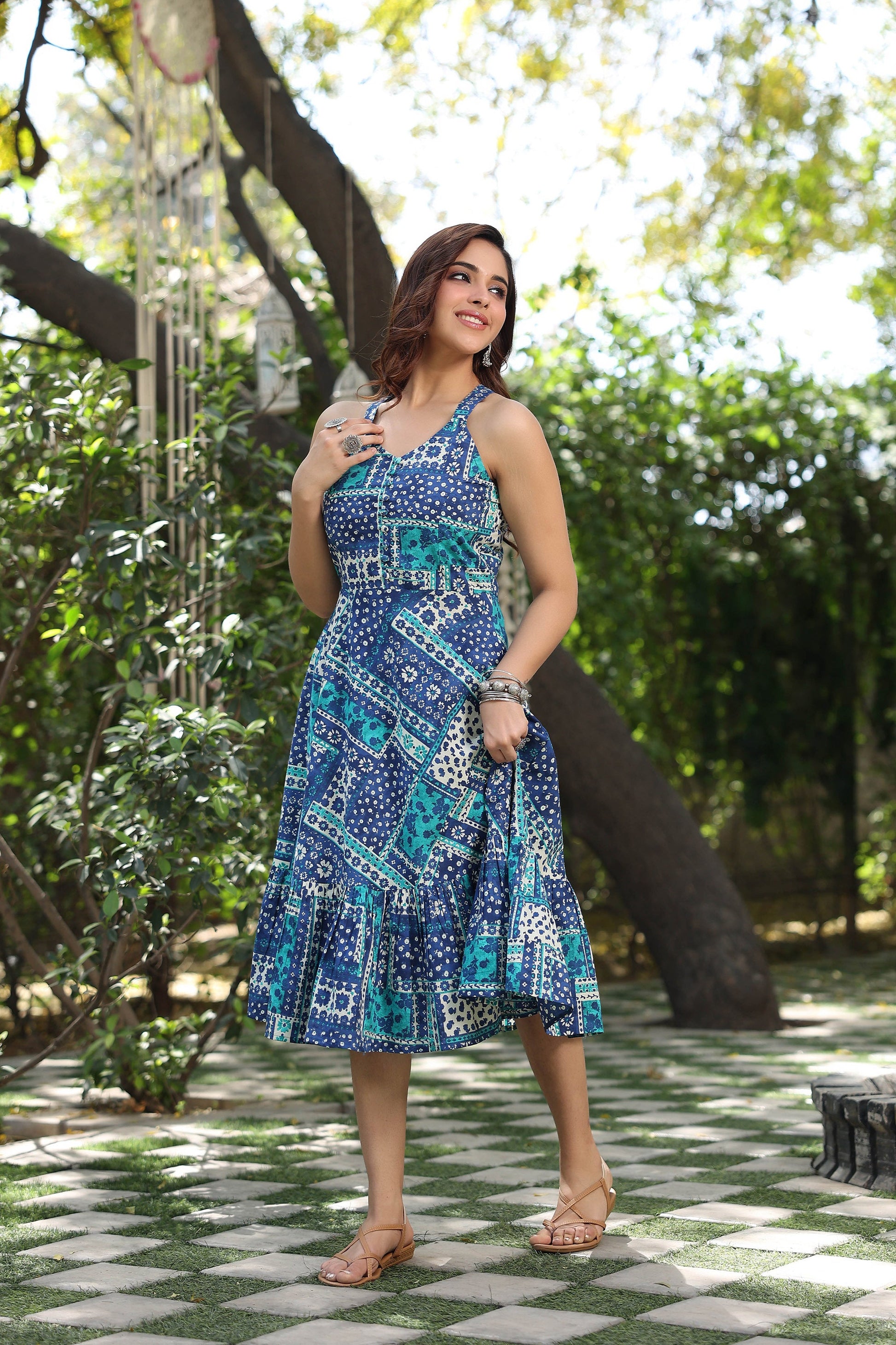 This is a blue abstract printed dress, A-line sleeveless dress, midi length dress with flared hem, slip-on closure with zip detail