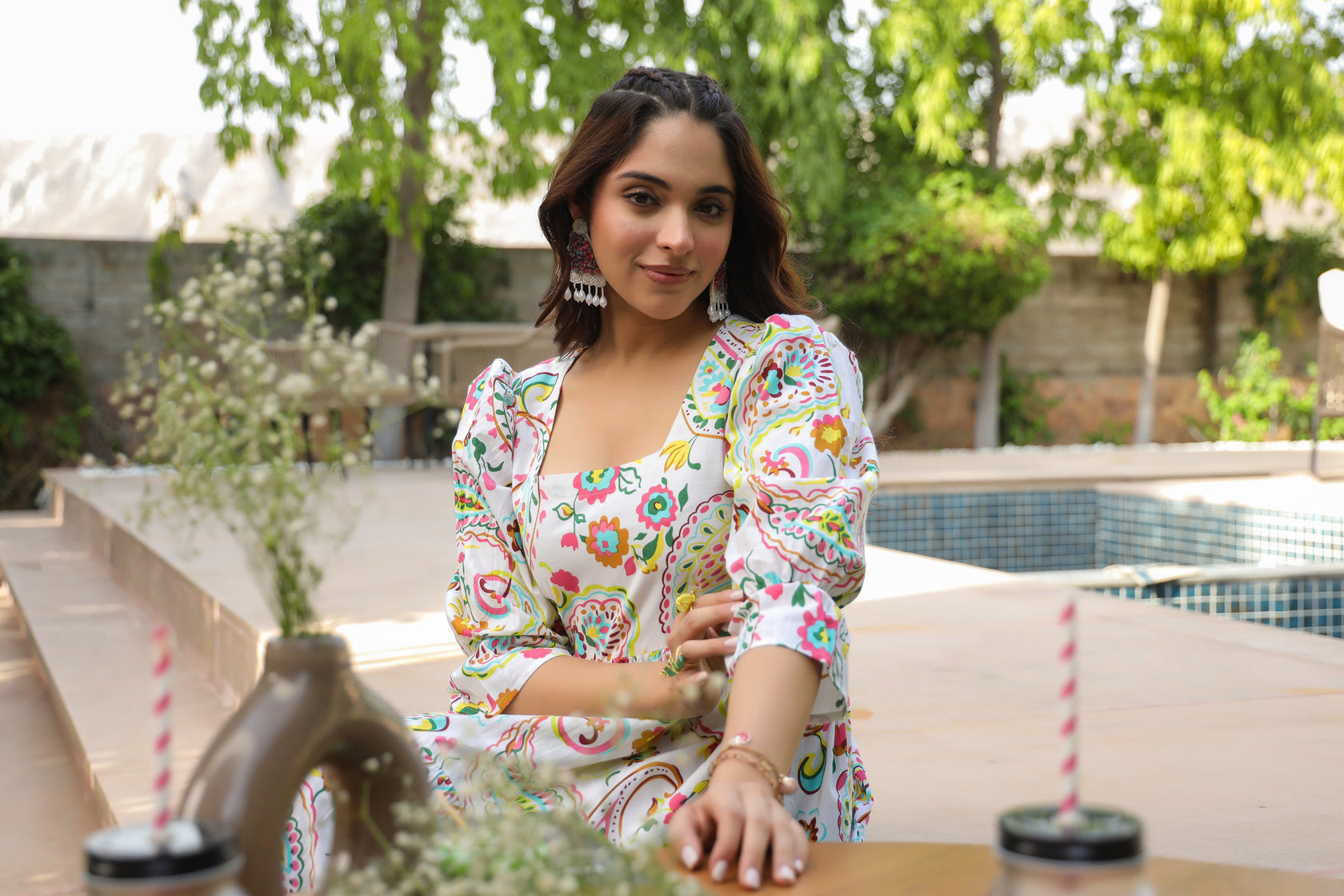 This white ethnic motifs printed cotton dress is a fresh and feminine choice for any occasion. Featuring a square neckline and three-quarter puff sleeves, the dress flaunts a flattering fit-and-flare silhouette with tiered detailing for added movement and charm.