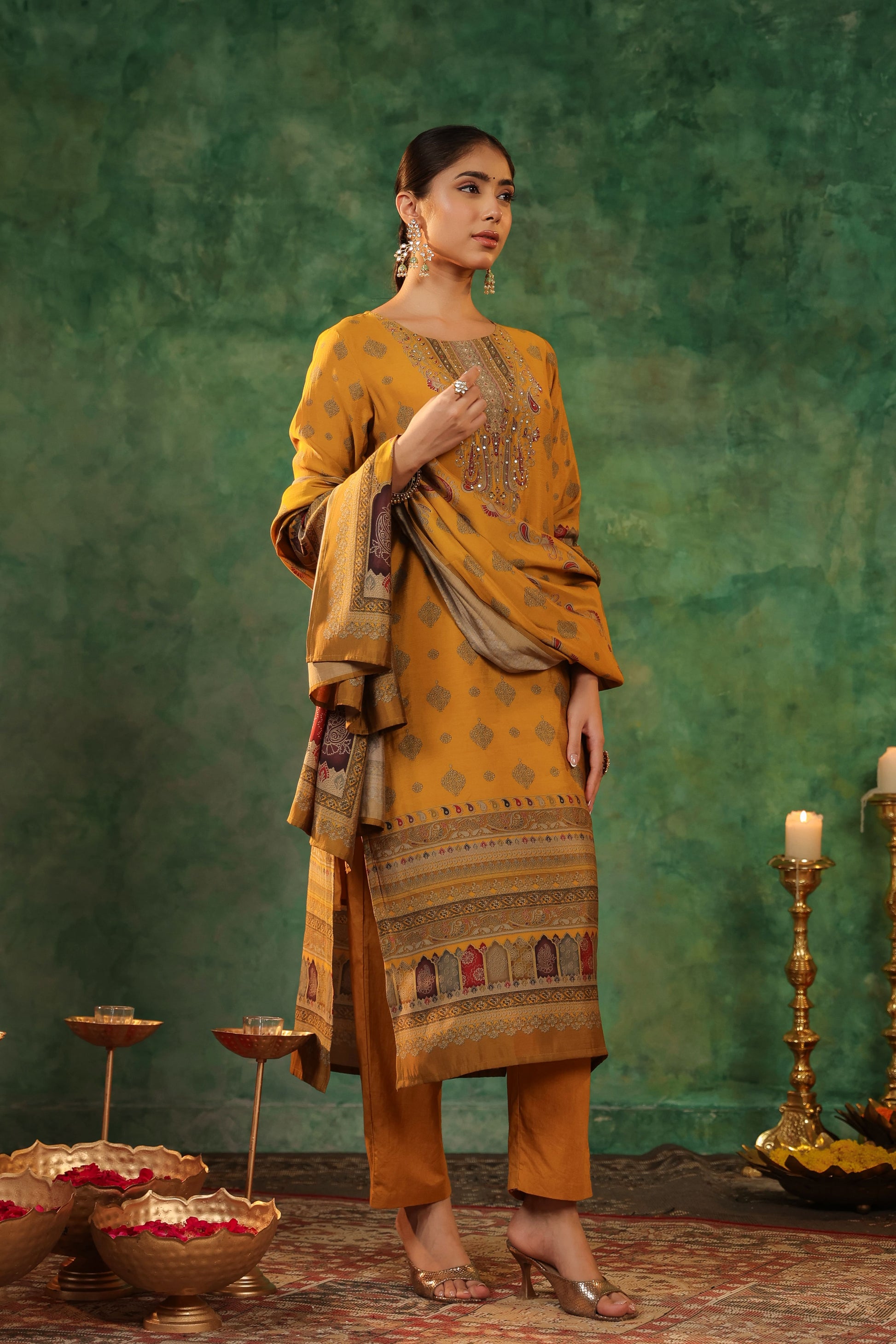 This is a mustard ethnic motifs printed kurta set with solid trousers and printed muslin dupatta, round neck kurta with beads and sequence detail at yoke, three-quarter sleeves straight kurta, solid rayon trousers with elasticated waistband and slip-on closure, printed muslin dupatta.