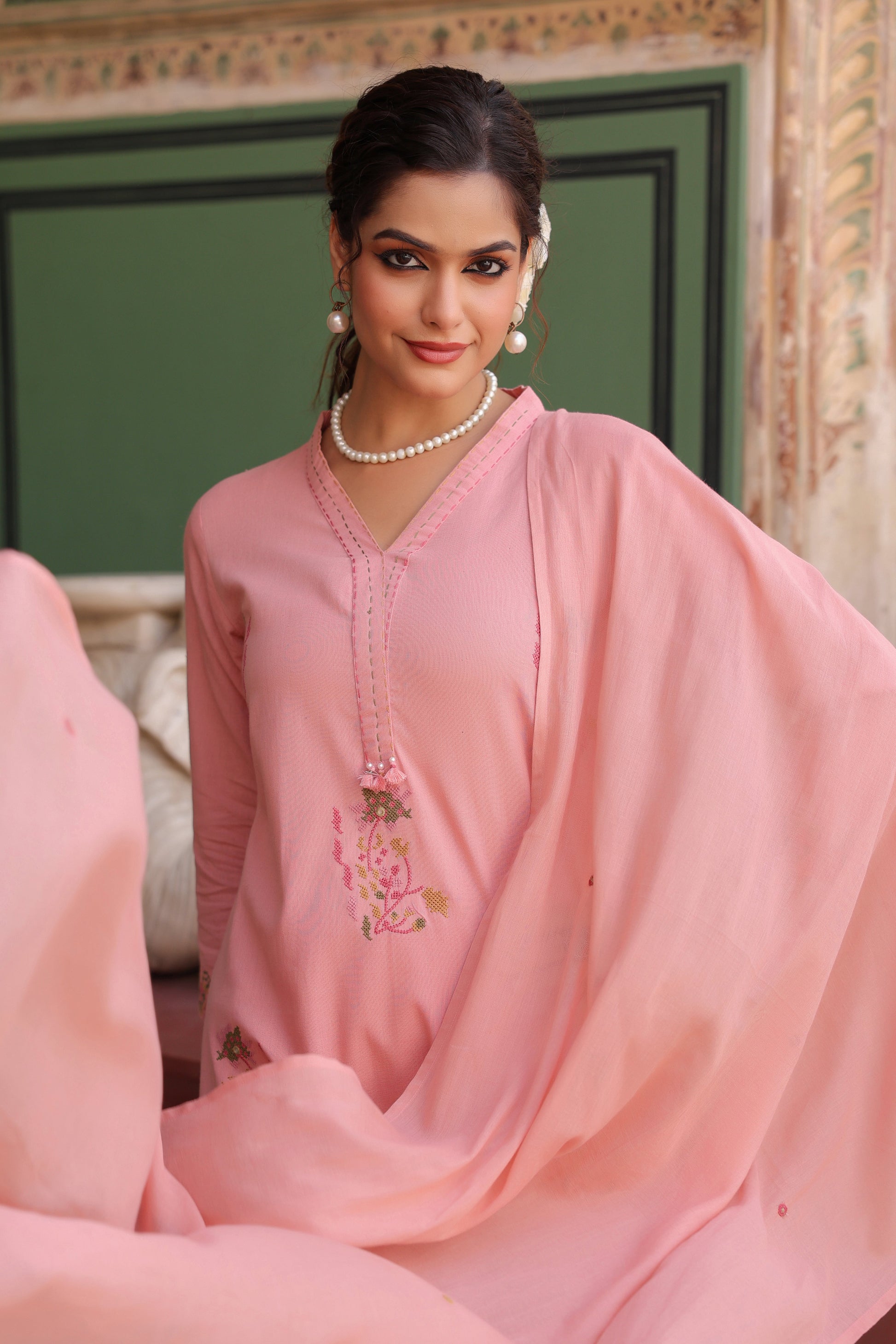 Bright, elegant, and oh-so-pretty! This pink solid kurta set is perfect for little festive stars. The V-neck kurta features beautiful katha work at the neckline, delicate embroidery, and comfy three-quarter sleeves in a straight fit. It’s paired with matching solid pink mid-rise trousers with an easy slip-on waist, and a soft dyed cotton dupatta finished with playful tassels