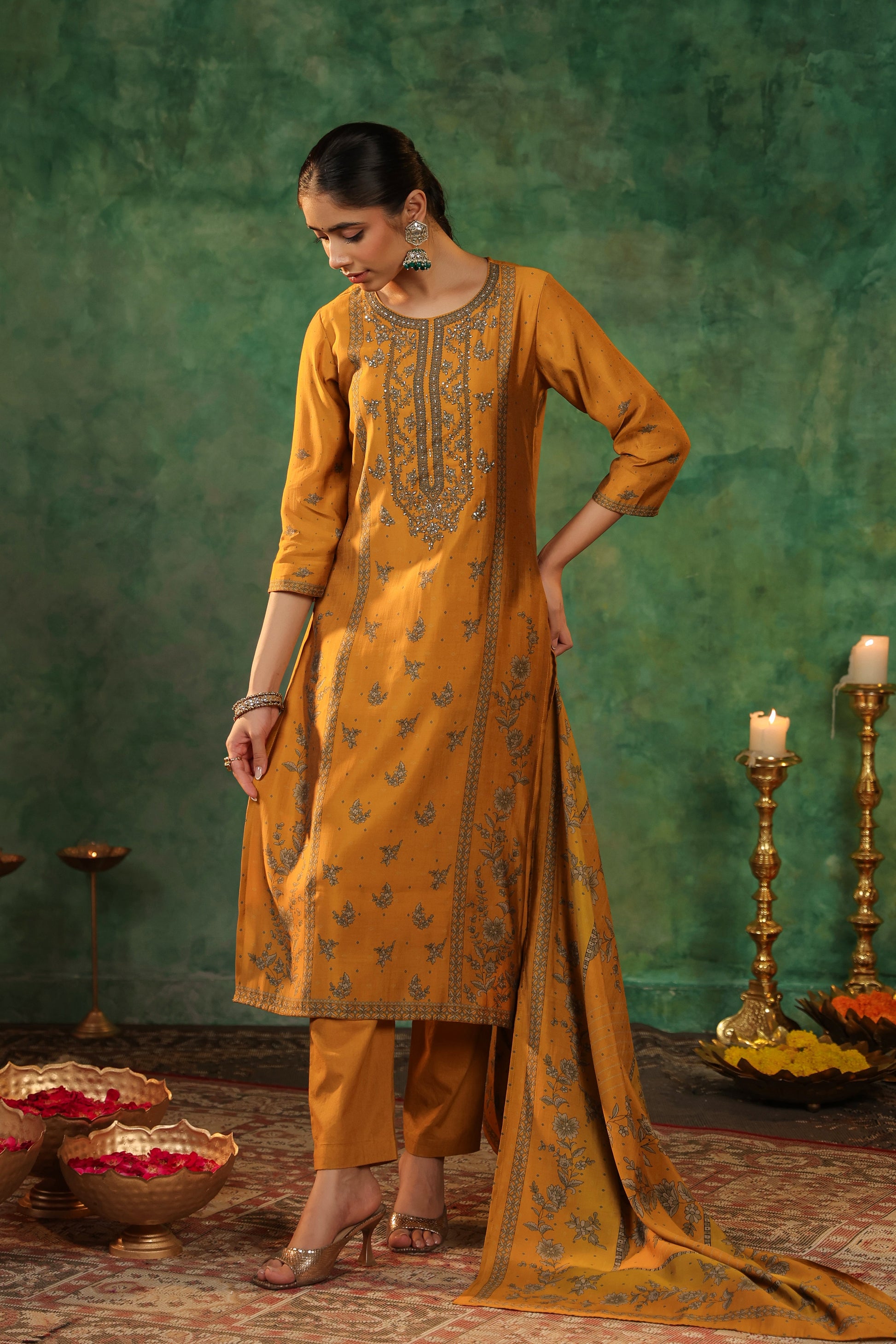 This is a mustard ethnic motifs printed kurta with solid trousers and printed muslin dupatta, round neck with beads and sequence detail, three quarter sleeves straight kurta, solid mid rise trousers with slip-on closure, printed muslin dupatta.