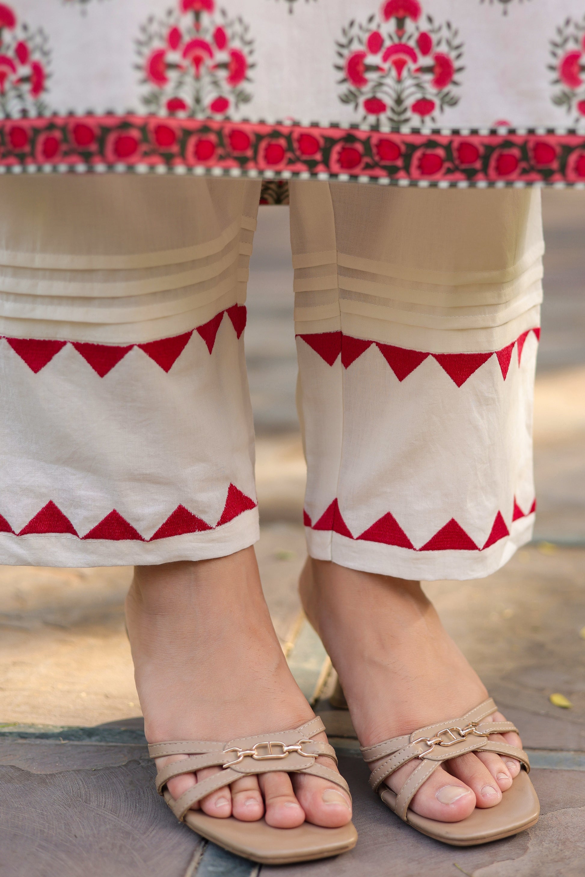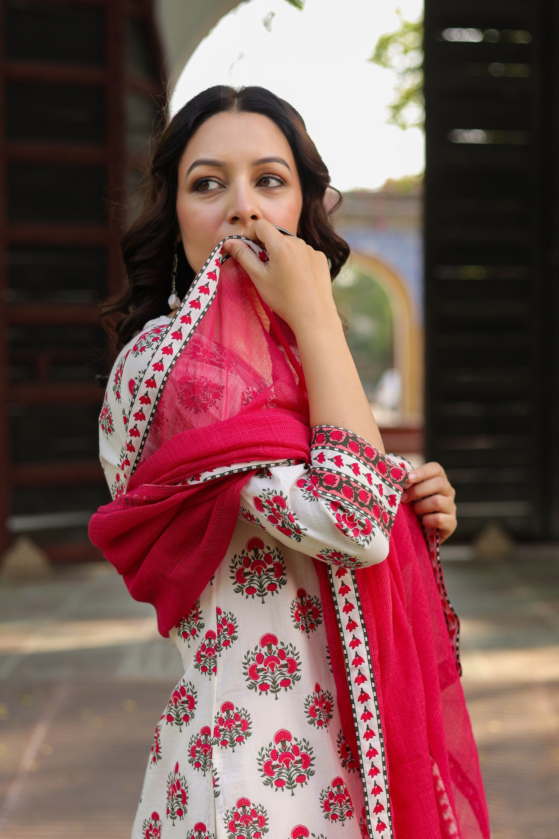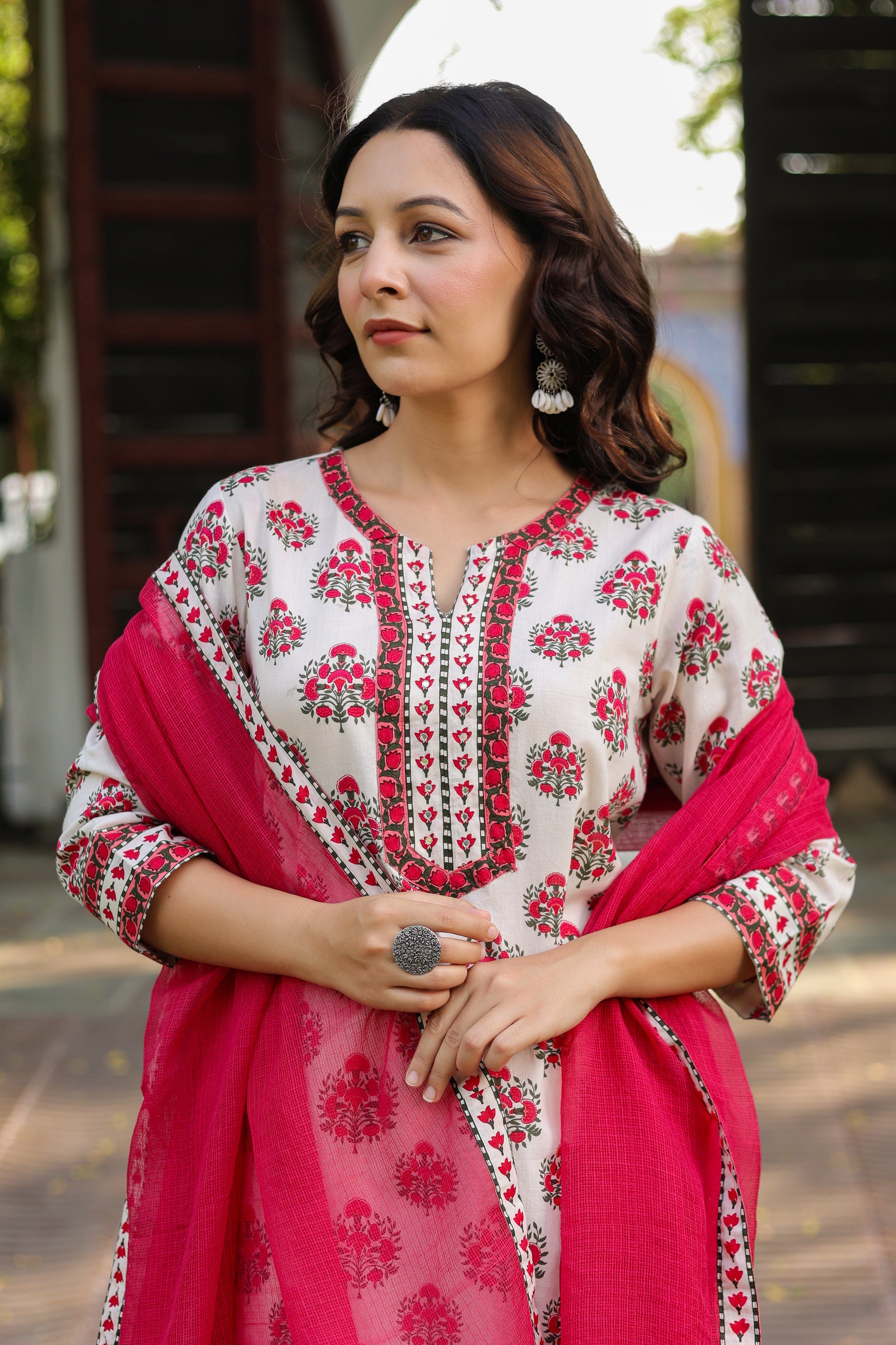 Floral Printed Notch Neck Pure Cotton Kurta With Trousers & Dupatta