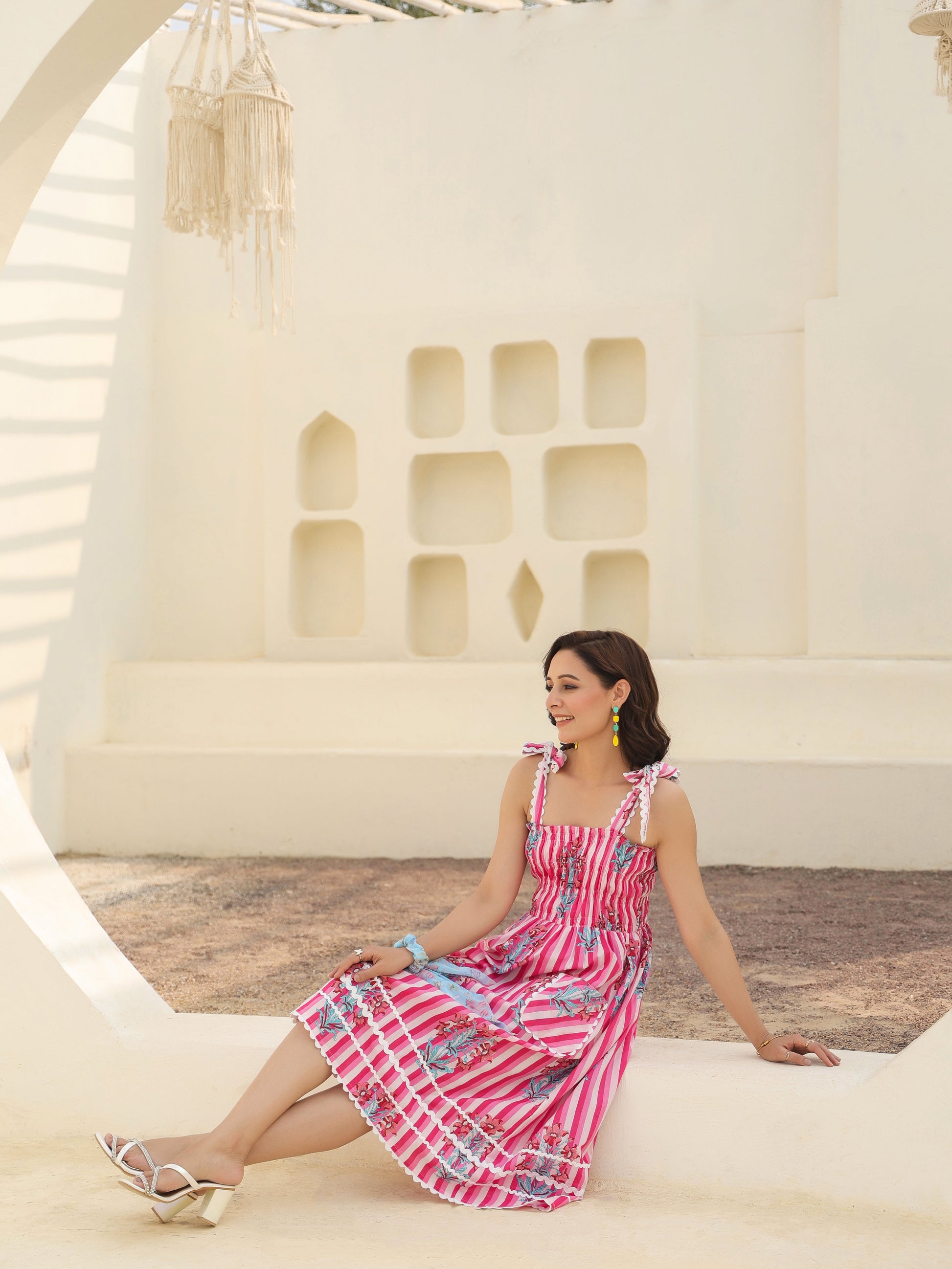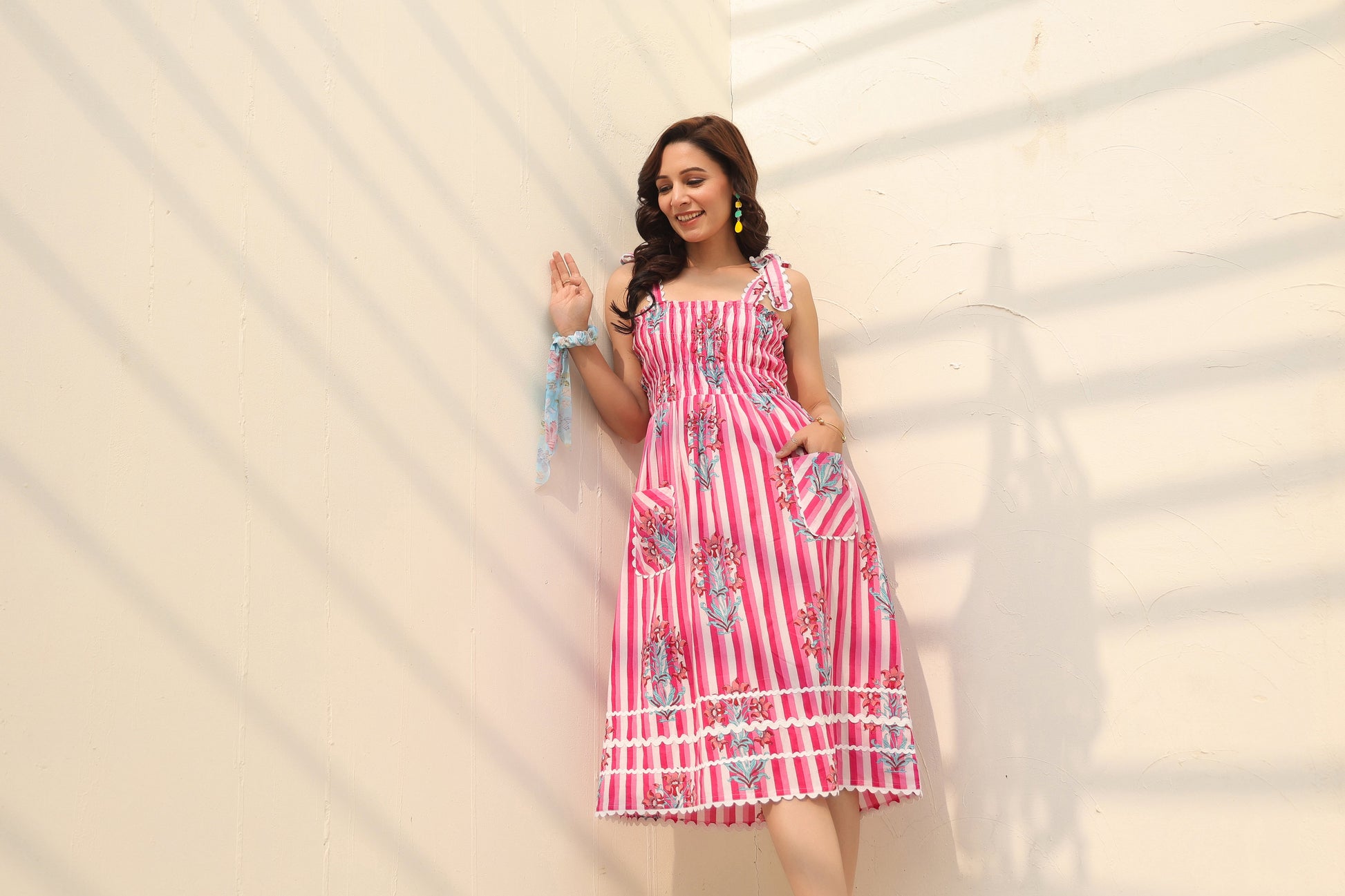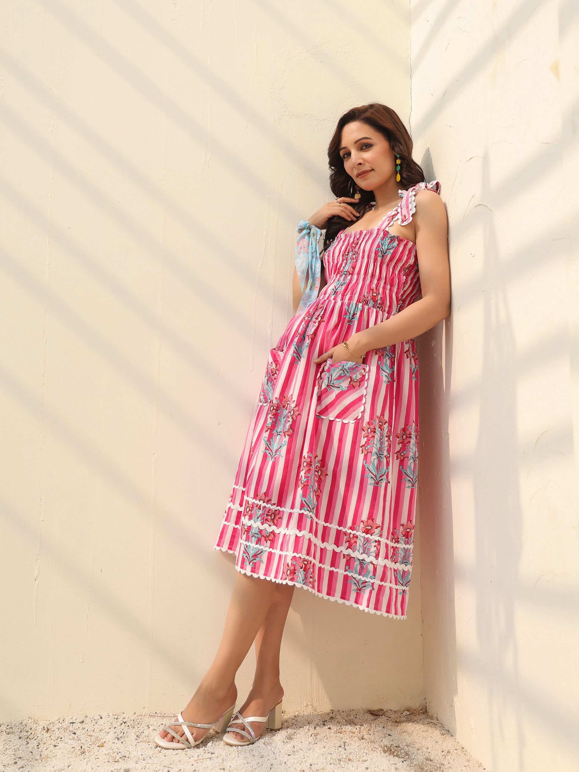 This is a pink floral printed sleeveless dress, shoulder straps with tie-up detail, elasticated body, fir and flare dress with 2 pockets.
