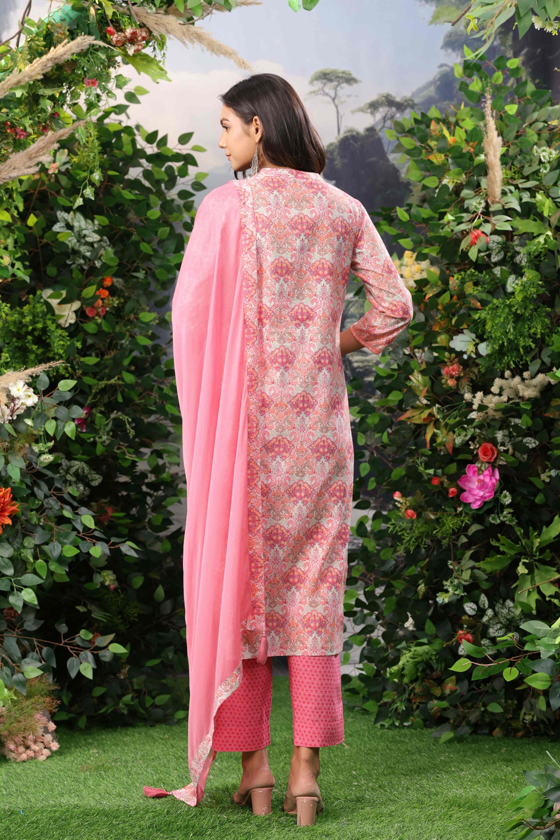 This is a pink printed kurta set with trousers and dyed chiffon dupatta, floral printed straight cotton kurta, mandarin collar kurta with sequinned detail, three-quarter regular sleeves kurta with 2 pockets, calf length kurta with straight hem, printed trousers with elasticated waistband.