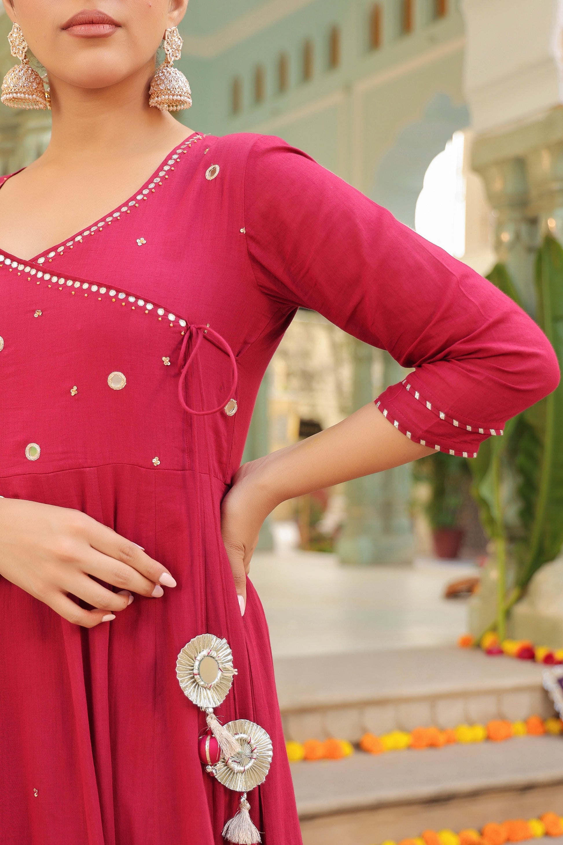 This elegant 3-piece set features a pink Angrakha-style Anarkali kurta with a V-neckline adorned in mirror embroidery and heavy tassel detailing. The kurta comes with three-quarter sleeves enhanced with gota work for a festive touch. Paired with solid pink mid-rise trousers featuring a comfortable slip-on closure, and a pink dyed cotton dupatta with matching gota detailing