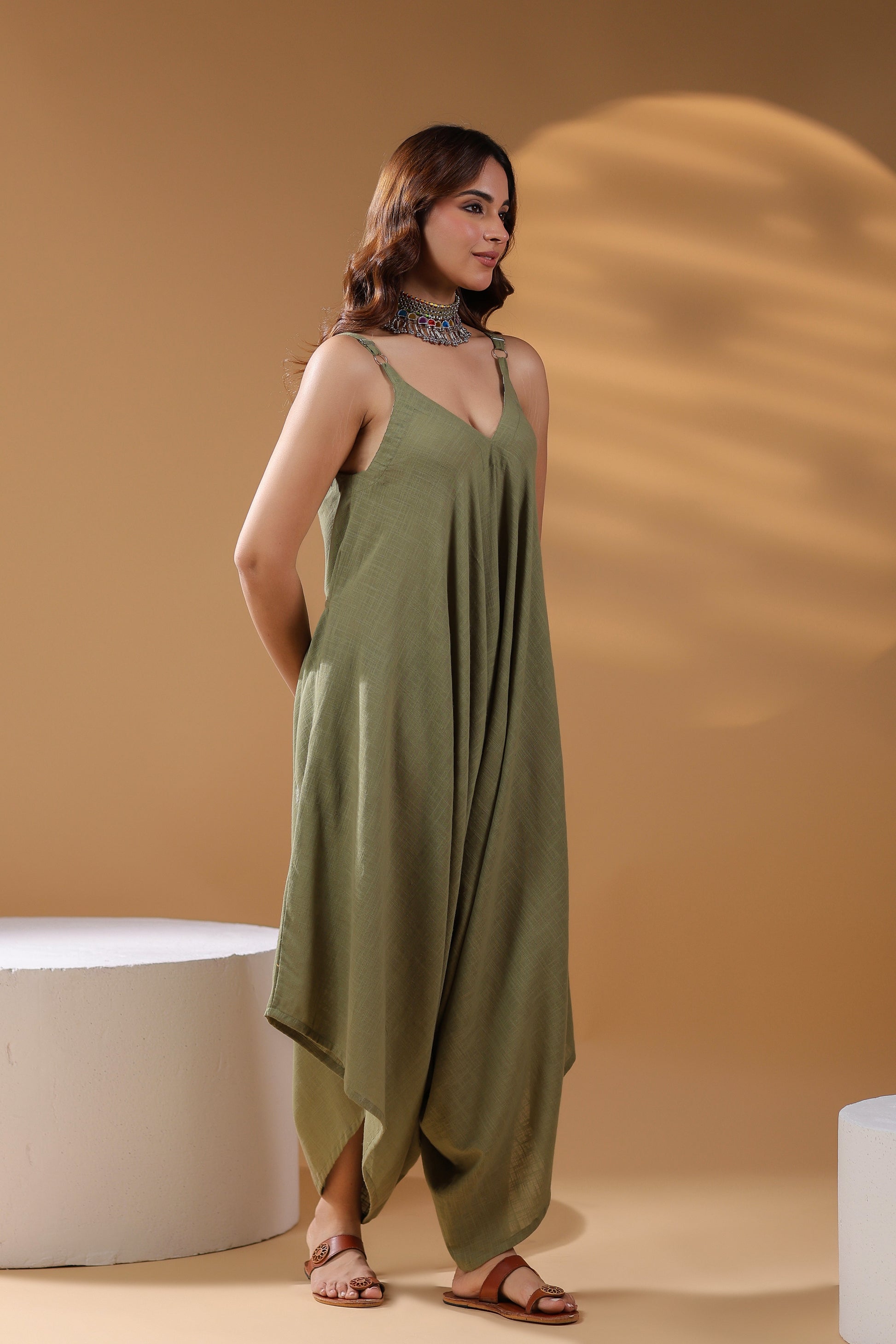 This is a green solid basic jumpsuit with shoulder straps, V-neck sleeveless jumpsuit with 2 pockets.