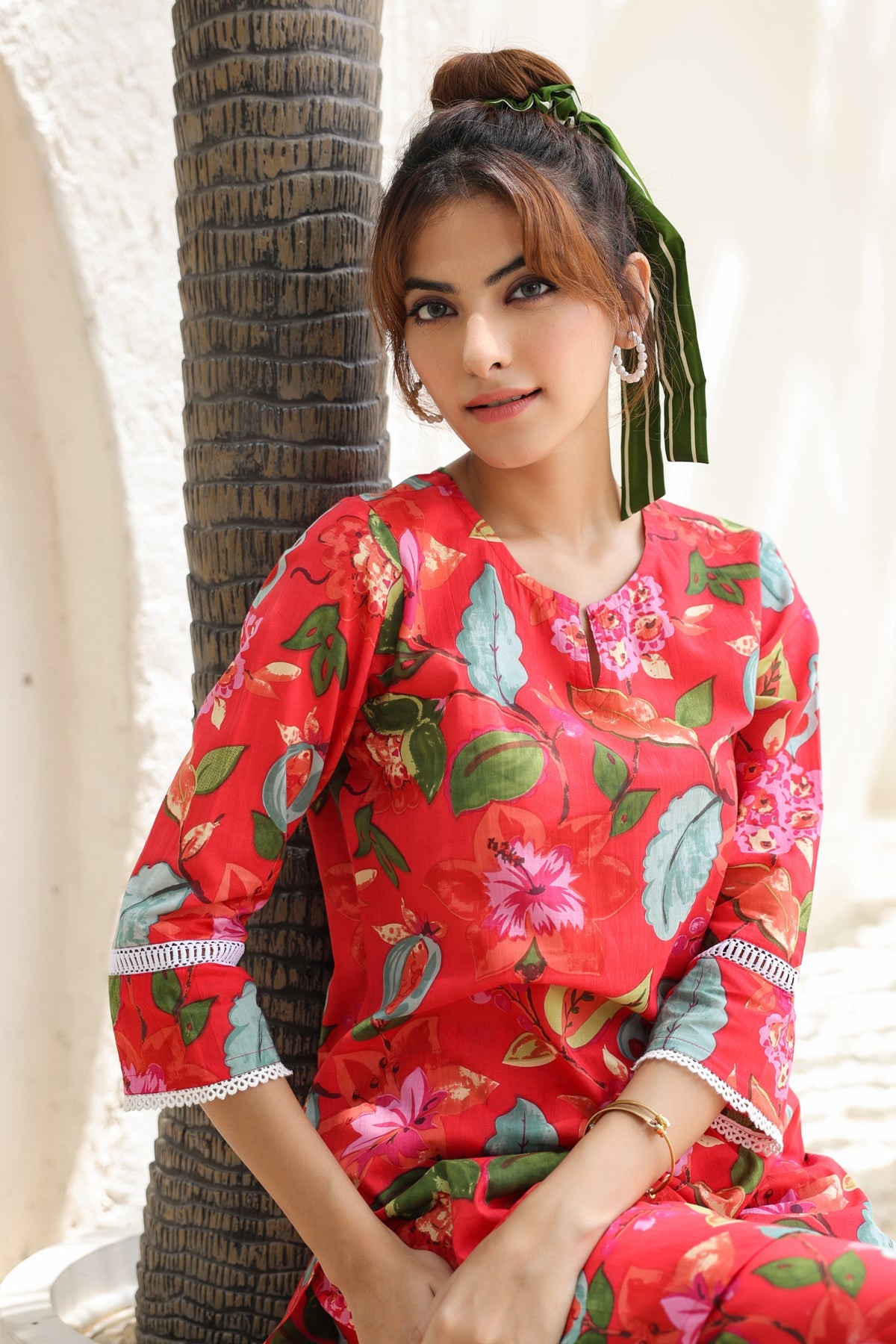 This cord consists of red floral printed tunic with matching trousers, notch neck tunic with three-quarter sleeves, tunic with 2 pockets and lace details, mid-rise trousers with slip-on closure and straight hem.