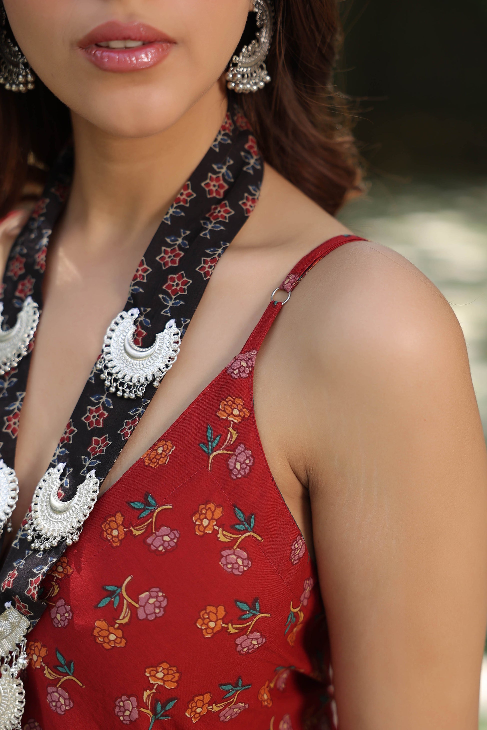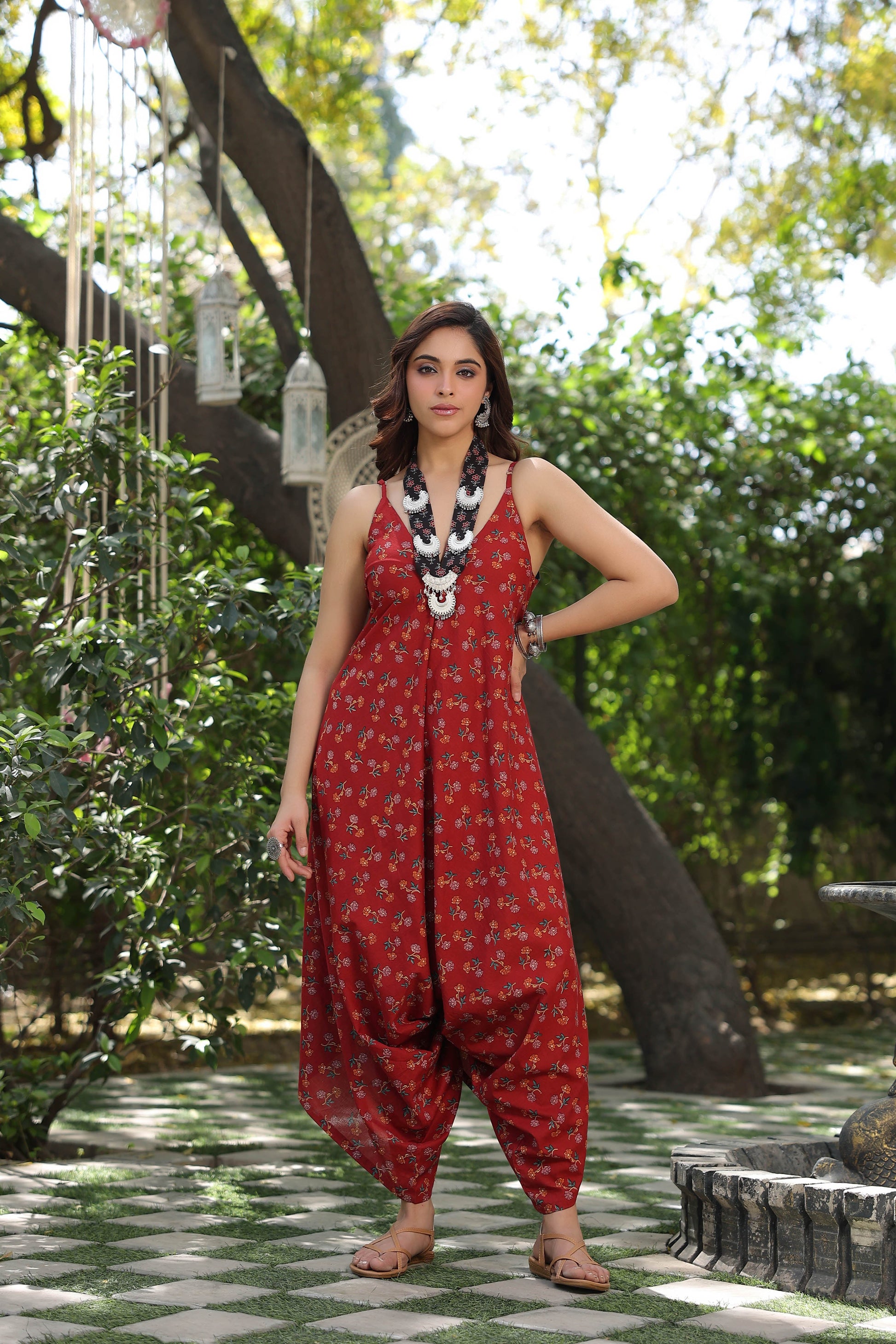 This is a maroon floral printed basic jumpsuit with shoulder straps, V - neck sleeveless jumpsuit with 2 pockets.