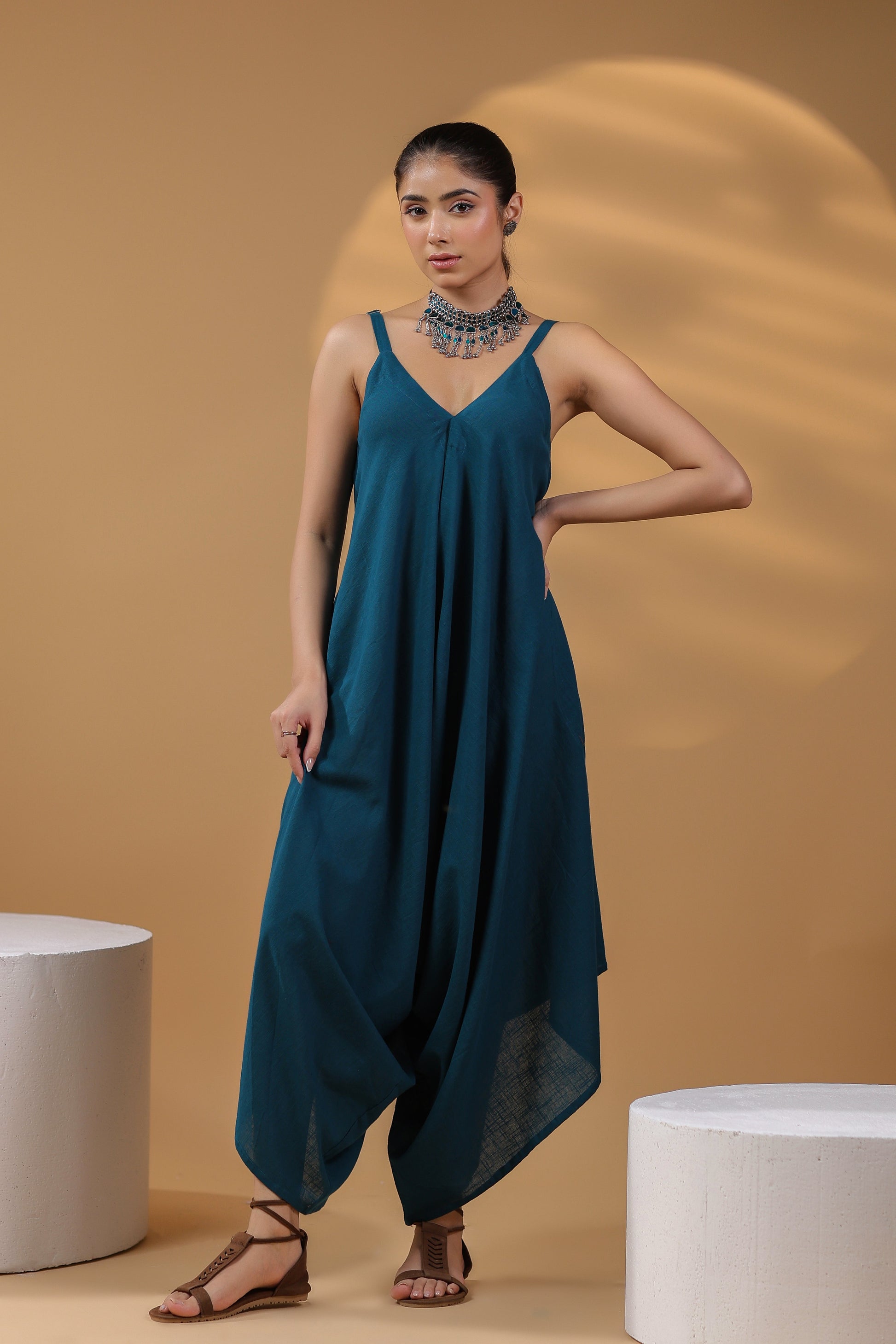 This is a teal solid basic jumpsuit with shoulder straps, V-neck sleeveless jumpsuit with 2 pockets.