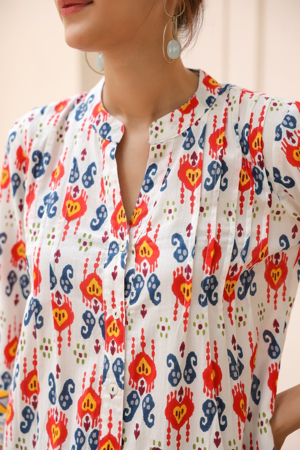 This is a white ikat printed shirt, mandarin collar shirt with pin tucks detail, three-quarter sleeves shirt with button closure.