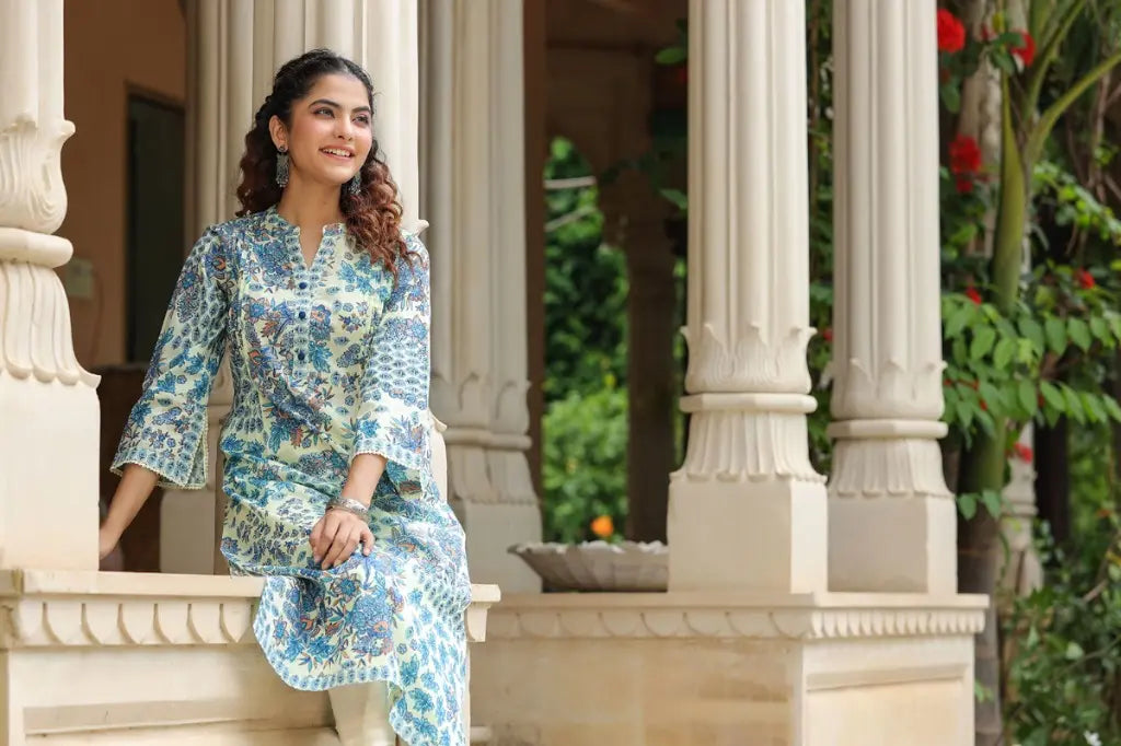 Discover the divine elegance of our Women Blue Floral Printed Pintucks Kurta. This kurta exudes modern style with a classic Mandarin collar, three-quarter sleeves, and a captivating floral print. It's a perfect blend of comfort and charm, ensuring you radiate timeless beauty on every occasion.