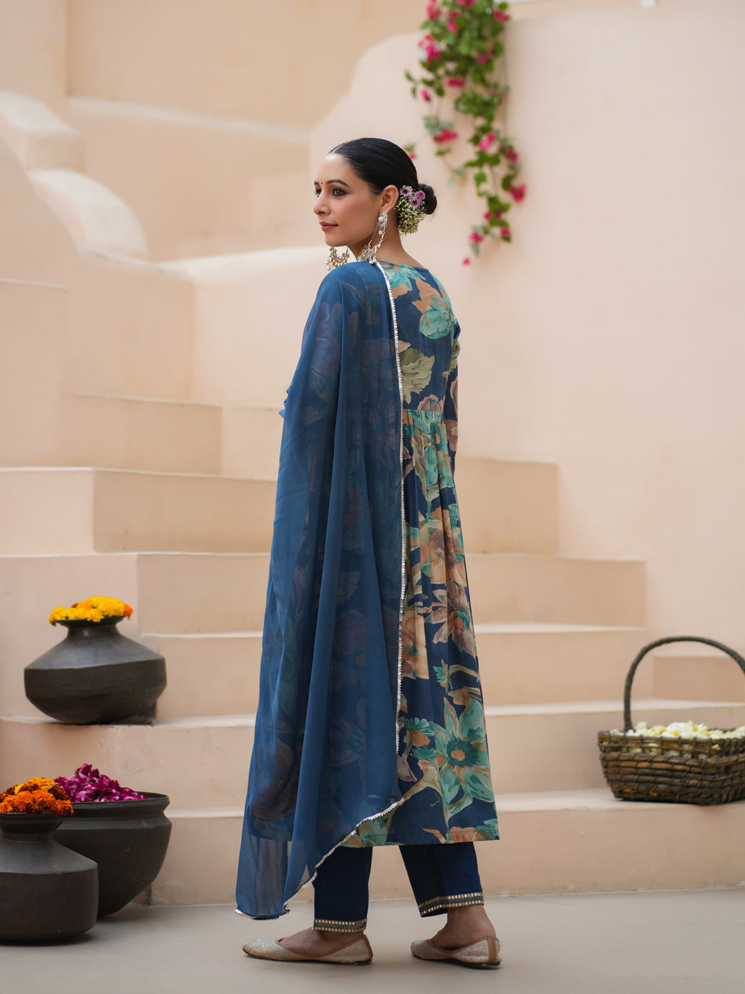 Blue Floral Printed Embroidered Kurta With Trouser And Dupatta, round neck empire style anarkali kurta with mirror work detail, three-quarter sleeves, calf length kurta with flared hem, solid trousers with elasticated waistband and poly shiffon dupatta.