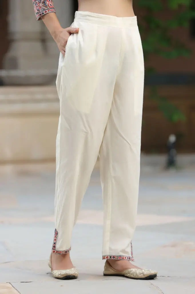 Cream-coloured, red, blue printed kurta with trousers with dupatta, floral printed a-line kurta, v-neck three quarter regular sleeves kurta with 2 pockets and sequinned detail, calf length wth flared hem, solid trousers with partially elasticated waistband