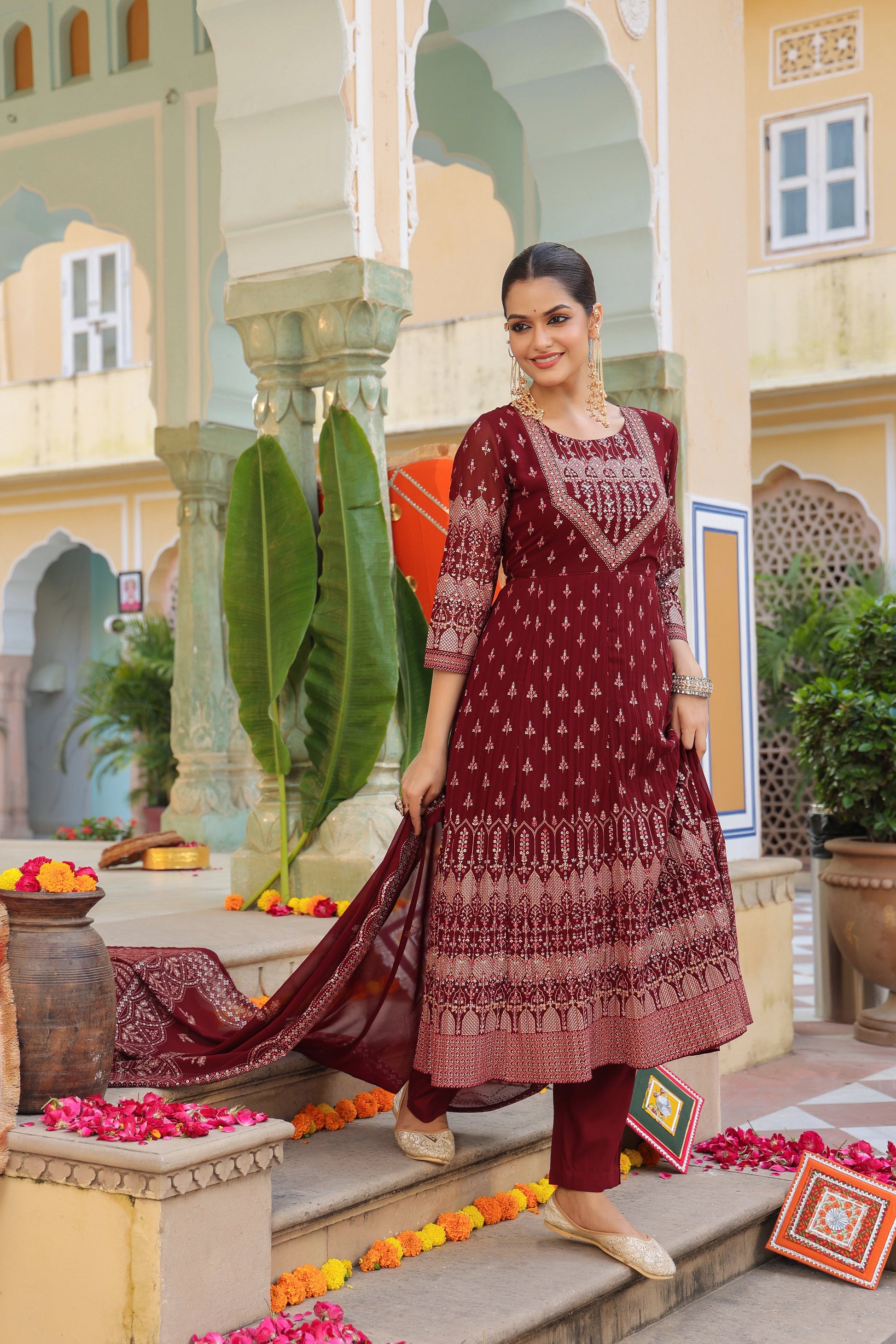 This elegant kurta set features a maroon Anarkali-style georgette kurta with ethnic motif prints, a round neck, and sequin detailing at the yoke. Paired with solid maroon mid-rise trousers and a matching printed georgette dupatta, it’s perfect for festive occasions and celebrations.