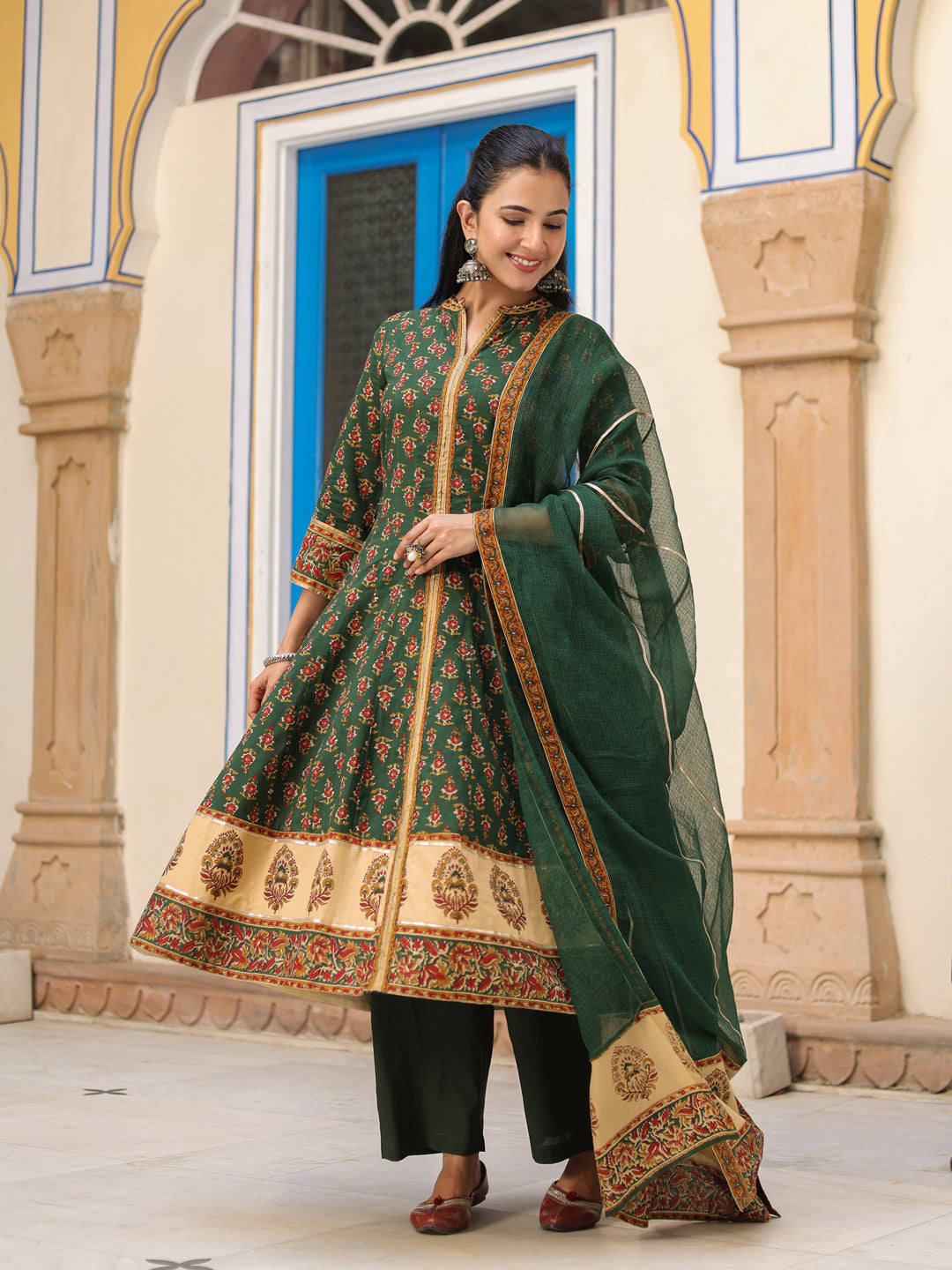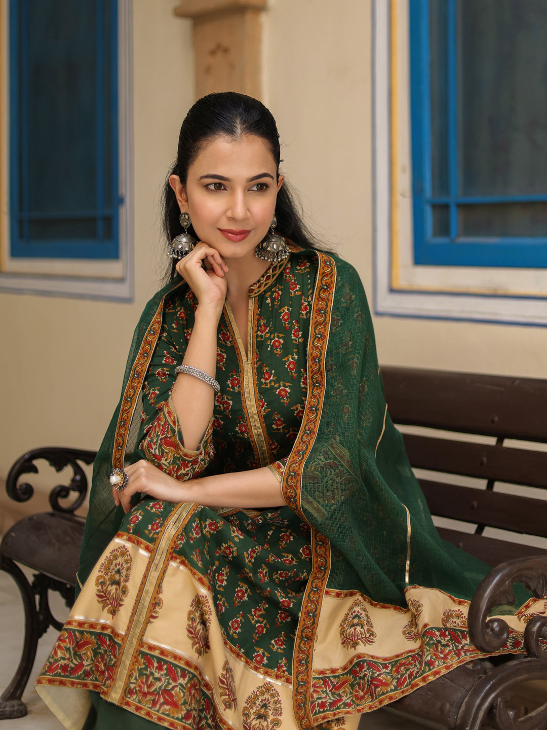 This elegant green kurta set features an Anarkali-style kurta with ethnic motif prints, a mandarin collar with delicate embroidery, and three-quarter sleeves with a bordered hem. It is paired with solid green mid-rise trousers with a slip-on closure and a dyed Kota Doriya dupatta enhanced with gota detailing, making it a perfect blend of traditional charm and modern comfort.