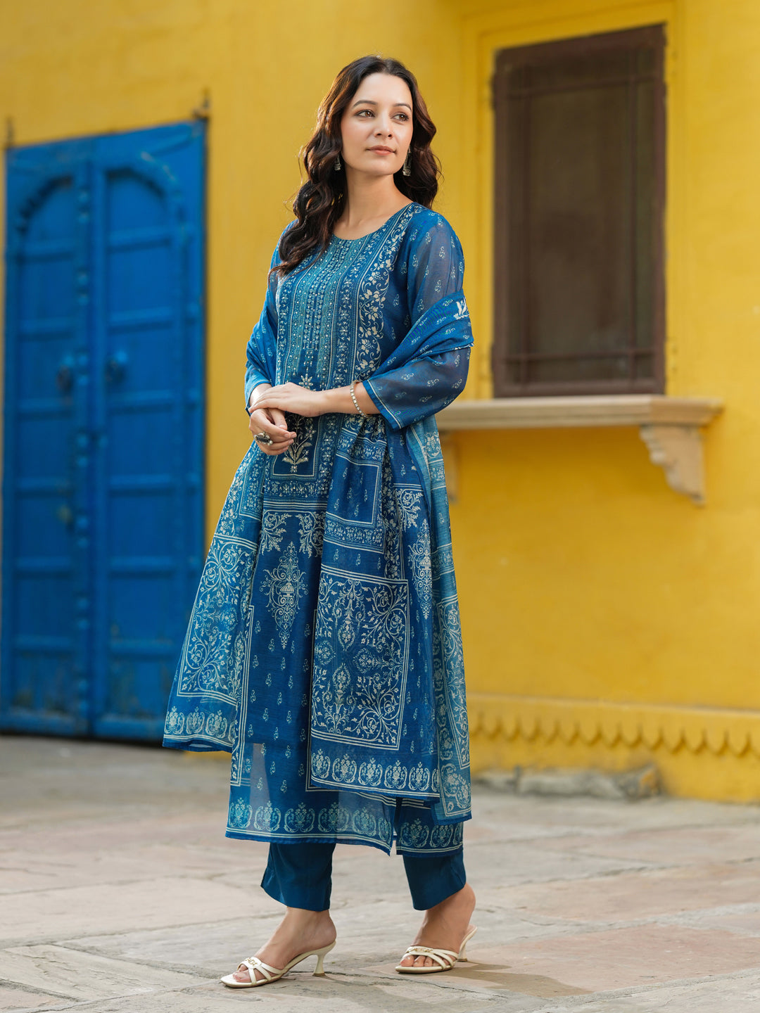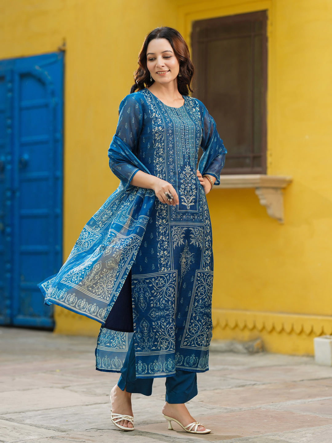 Step out in style with this blue ethnic motifs printed kurta set, featuring a round neck straight-fit kurta with three-quarter sleeves. It comes with solid blue mid-rise trousers with a slip-on closure and a digitally printed muslin dupatta for a complete, elegant look.