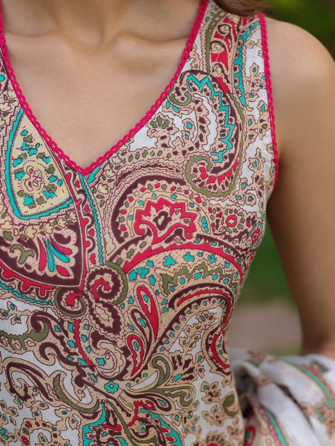 This white ethnic motifs printed kurta set combines simplicity with elegant detailing. The V-neck sleeveless kurta features delicate lace accents and a straight fit for a sleek silhouette. It pairs beautifully with solid white mid-rise trousers adorned with subtle geometric embroidery, and is completed with a matching printed cotton dupatta edged with lace for a refined finish.