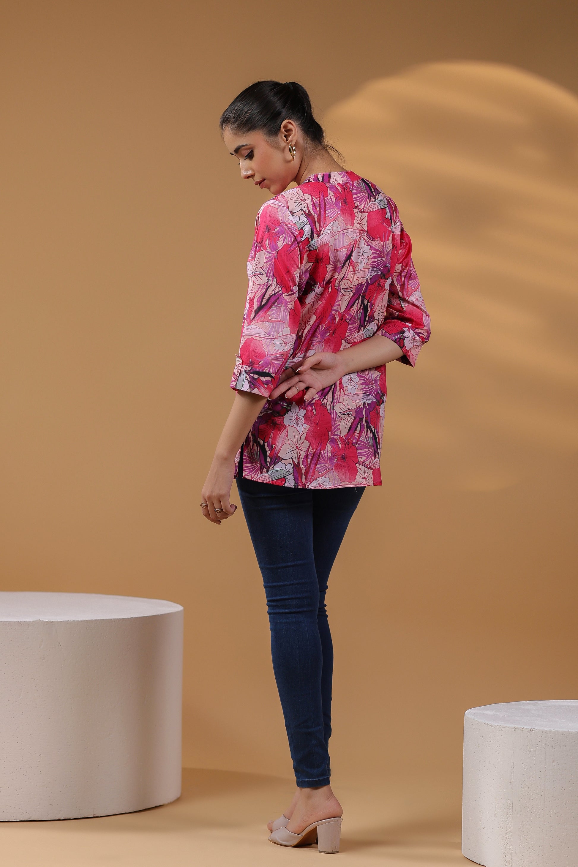 This is a pink floral digital printed top, mandarin collar top with button closure, three quarter sleeves, regular fit top.