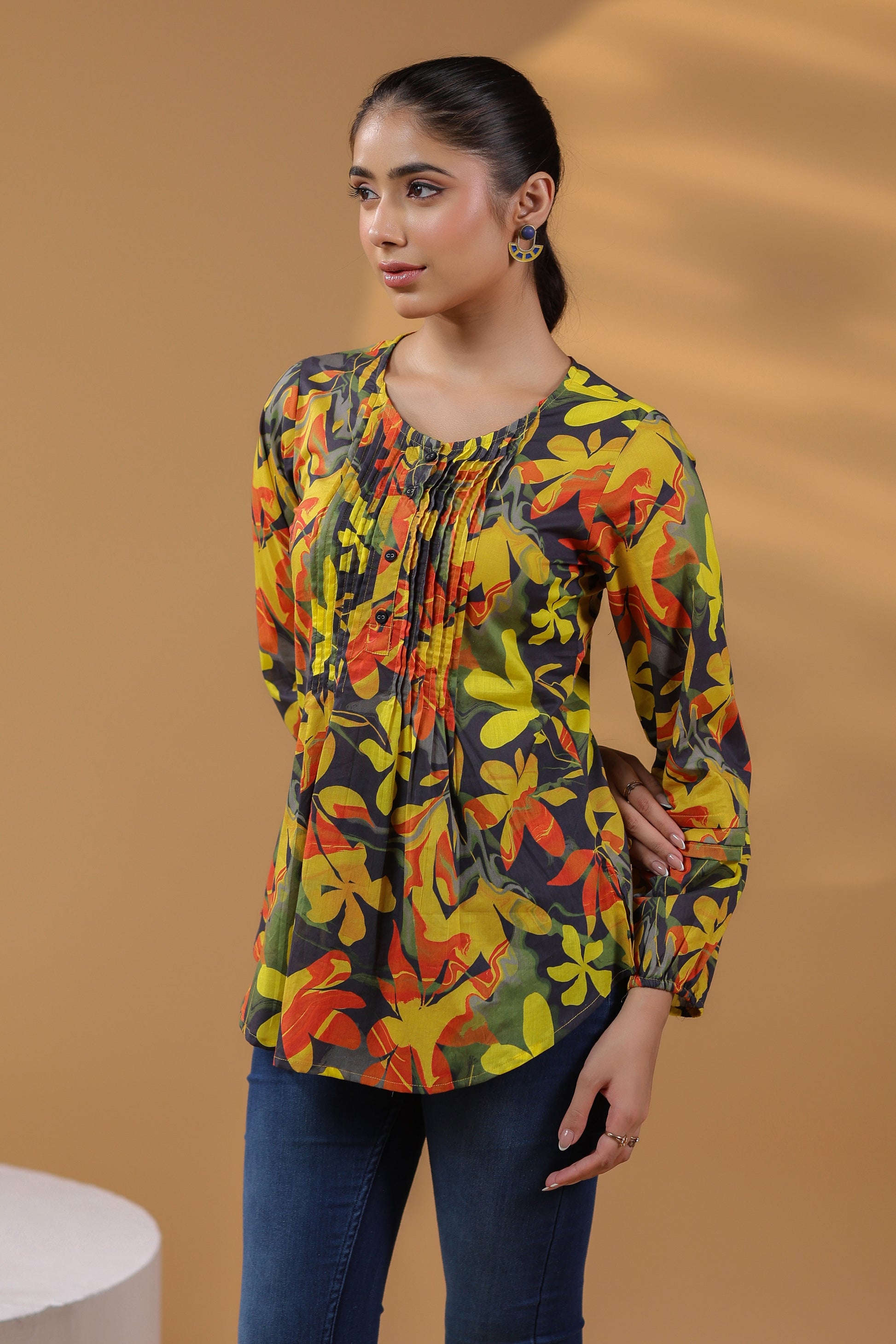 This is a black floral printed top, round neck top with button closure and pin tucks detail, long puff sleeves with tucks detail, curved hem top.