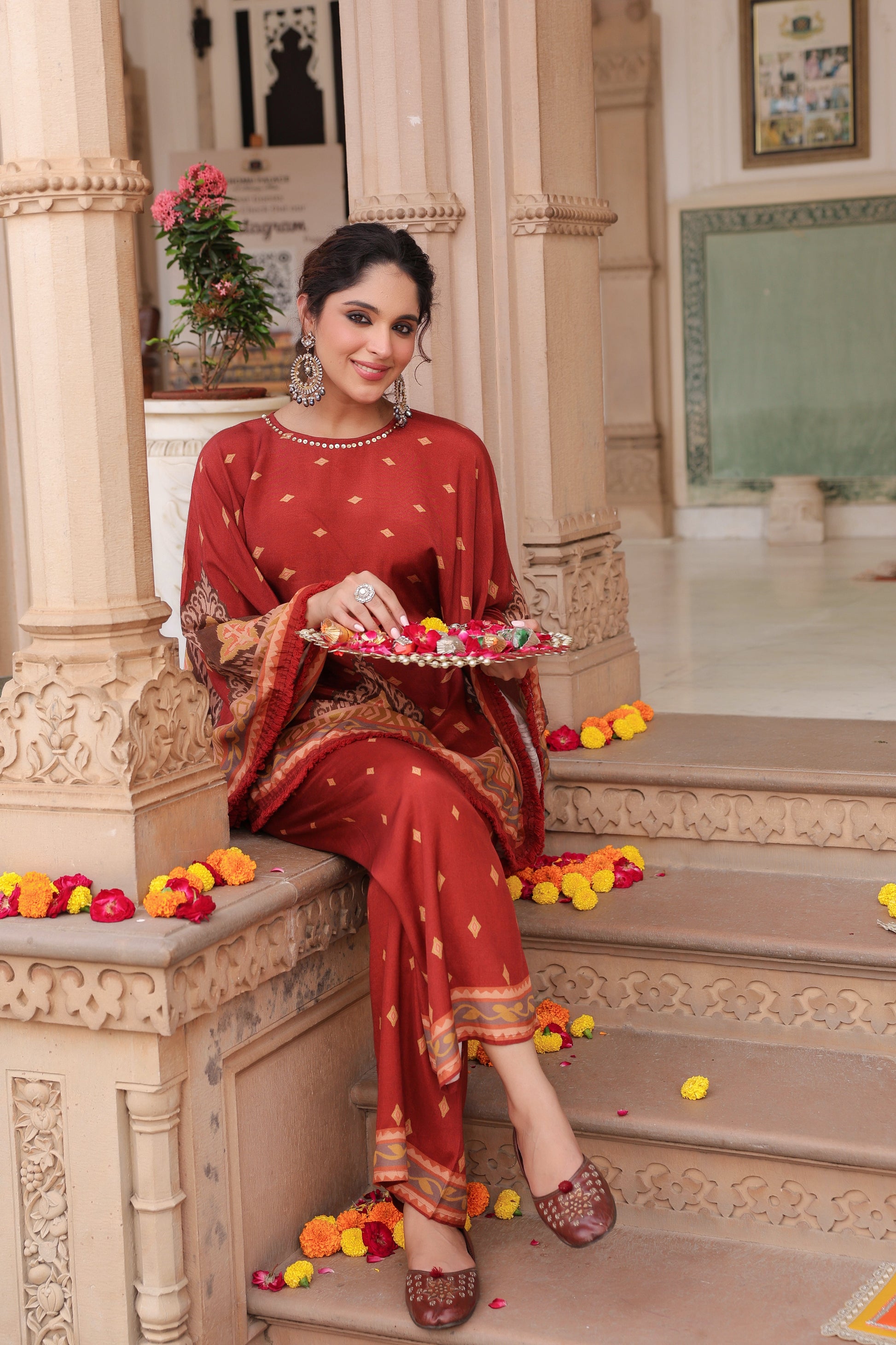 Make a statement with this red kaftan cord set featuring ethnic motif prints. The top comes with a round neckline adorned with bead detailing, long kaftan-style sleeves, and a relaxed fit for all-day comfort. Paired with a matching printed mid-rise trouser with a slip-on closure, this set is perfect for festive or casual wear.