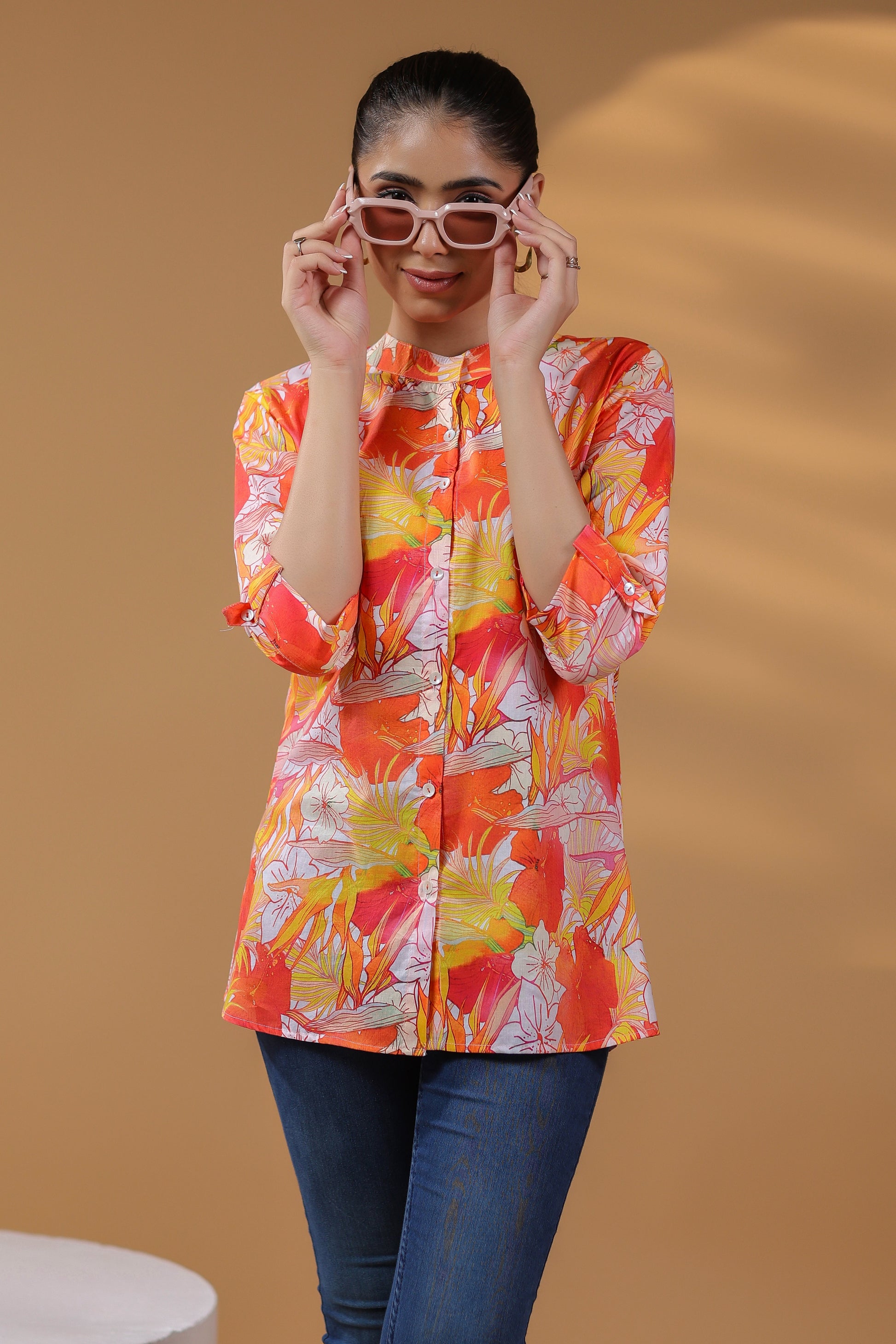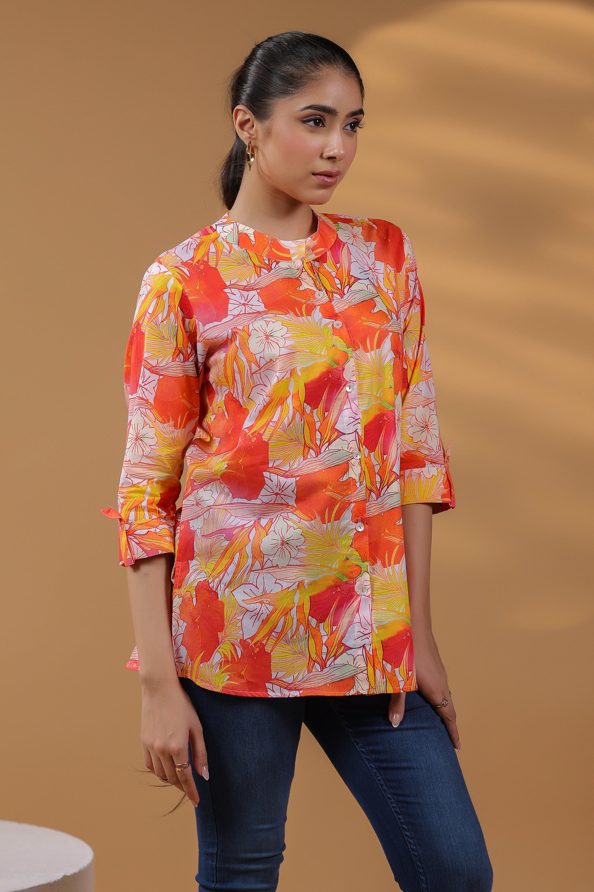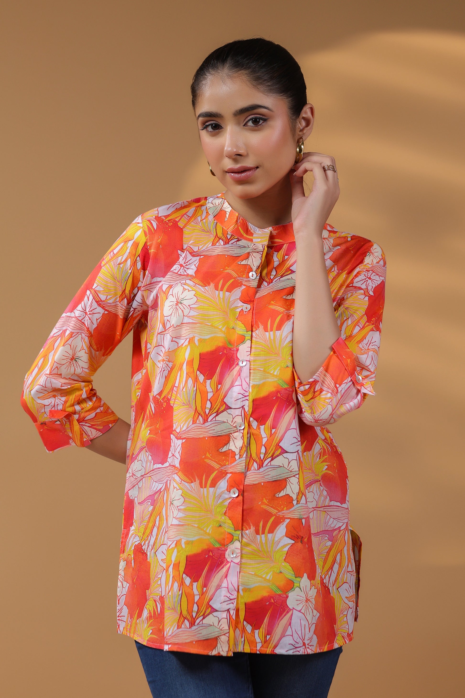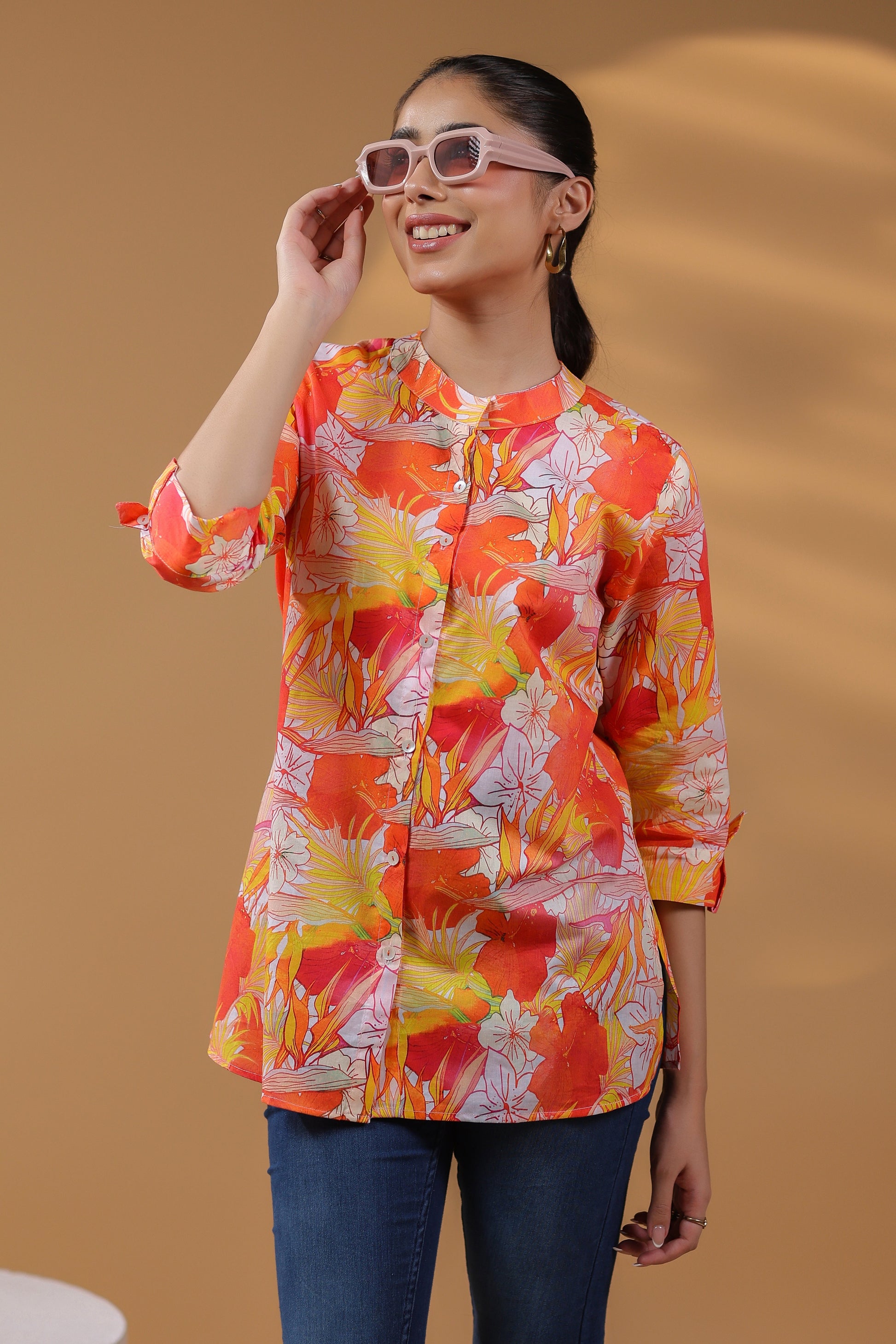 This is a orange floral digital printed top, mandarin collar top with button closure, three quarter sleeves, regular fit top.