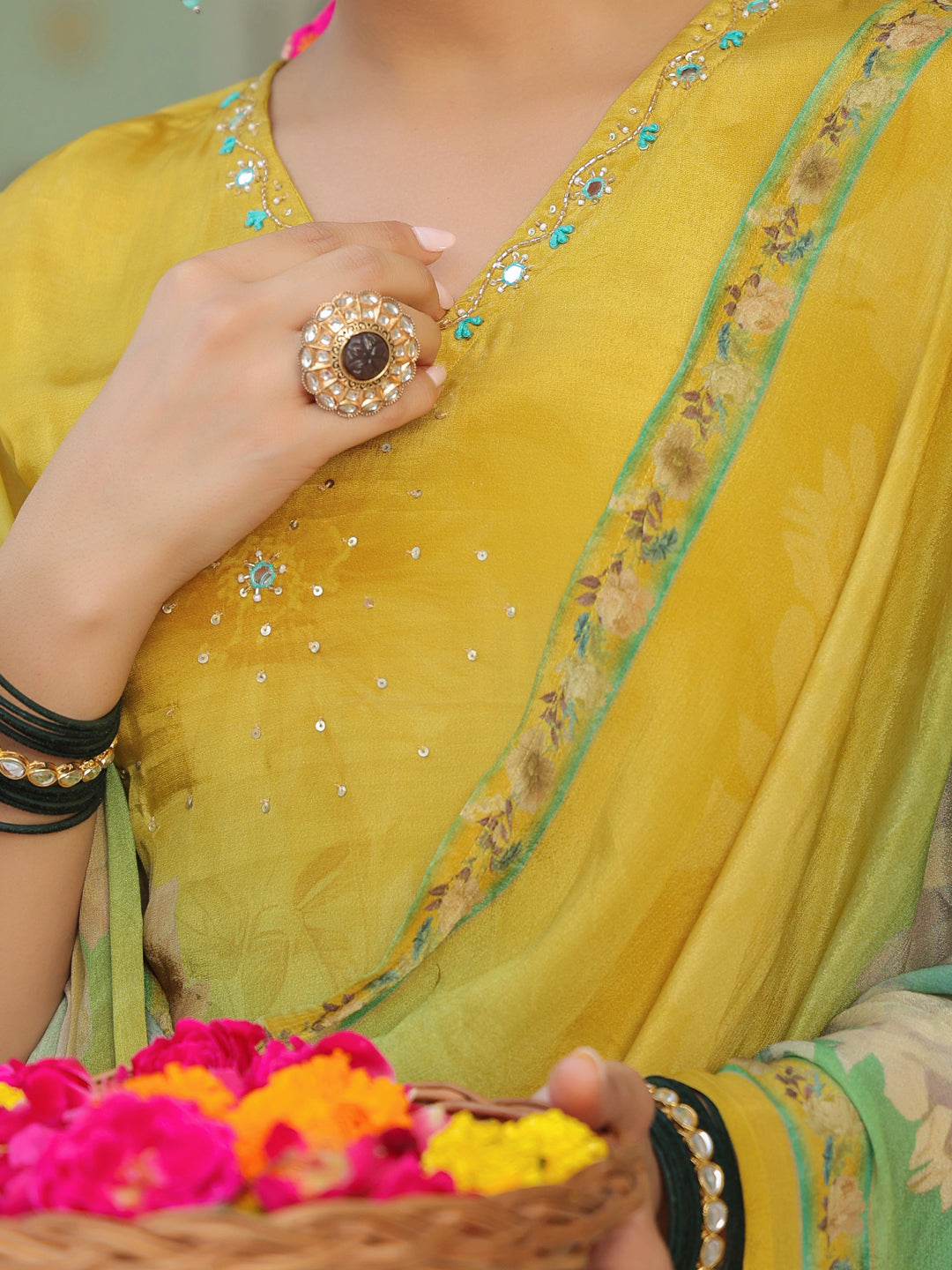 Grace your wardrobe with this yellow ethnic motifs printed kurta set, featuring a V-neck kurta with gota patti detailing, three-quarter sleeves, and a straight fit. Paired with solid yellow mid-rise trousers with a slip-on closure and a digitally printed muslin dupatta, this set blends tradition with modern elegance.