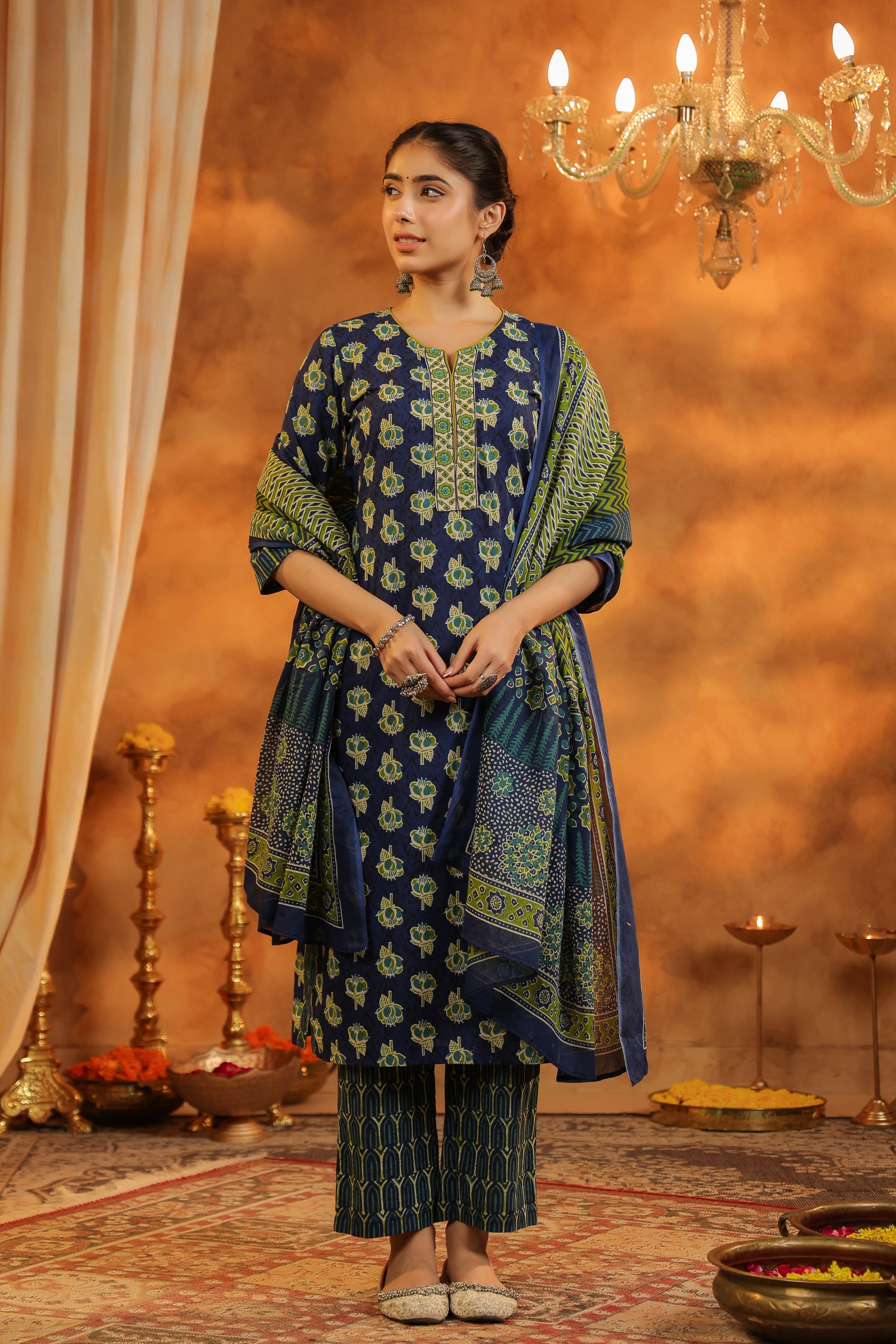 This is a blue ethnic motifs printed straight kurta with printed trousers and printed cotton dupatta, round neck kurta with embroidered yoke, three-quarter sleeves straight kurta with side slits, printed blue trousers with slip-on closure, printed cotton dupatta.