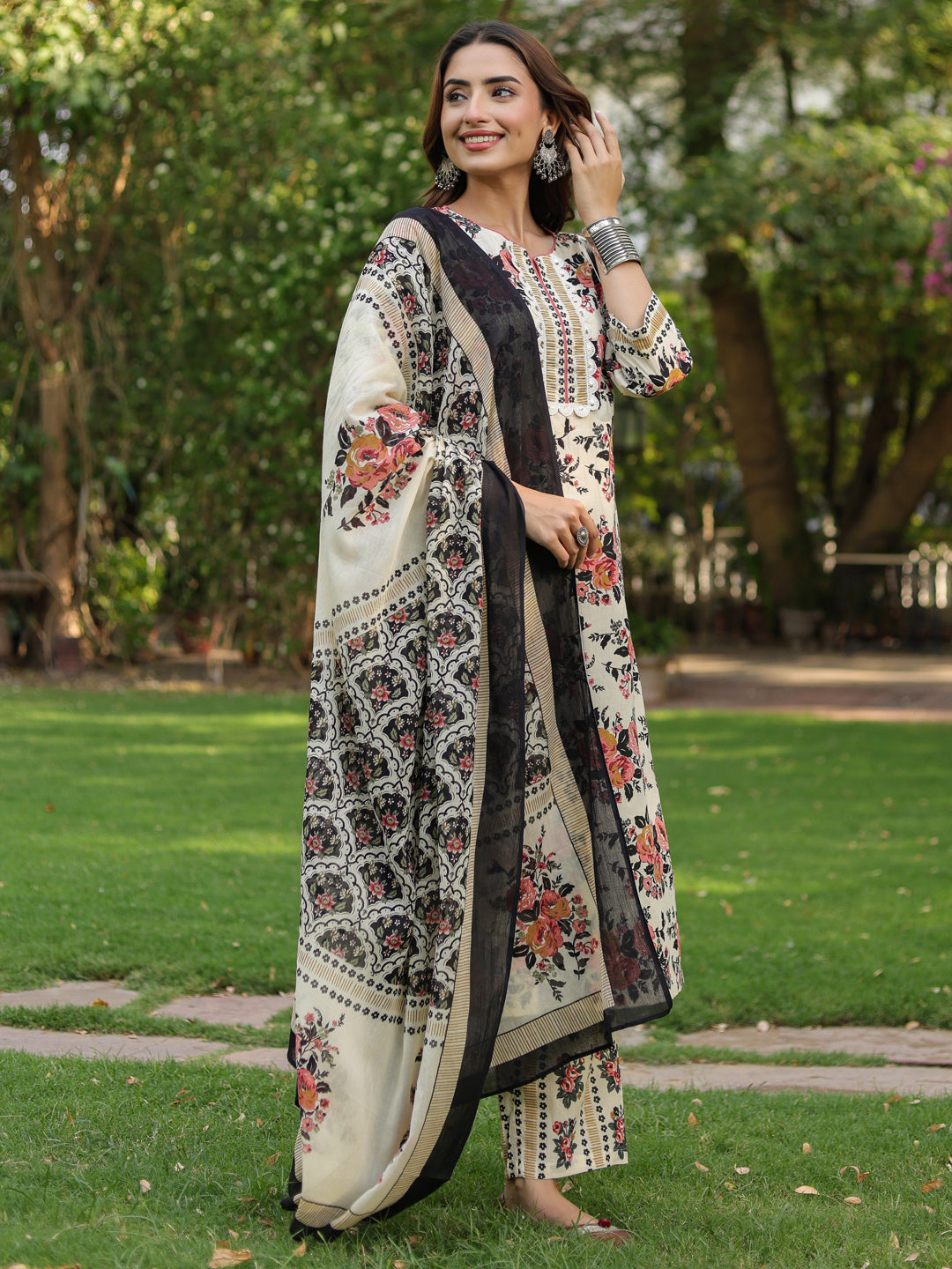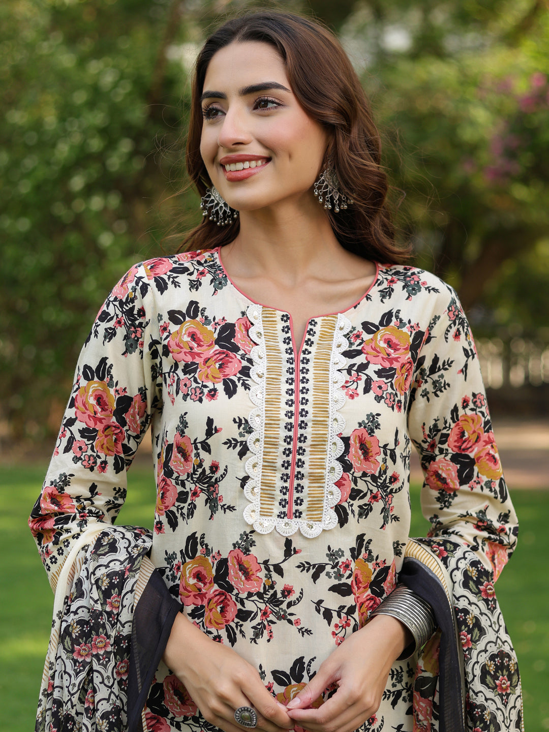 Graceful and breezy, this set features a beige straight-fit kurta with floral prints, a round neck with lace detailing, and three-quarter sleeves. It comes with matching printed mid-rise trousers (slip-on style) and a printed cotton dupatta, making it a perfect pick for everyday elegance.