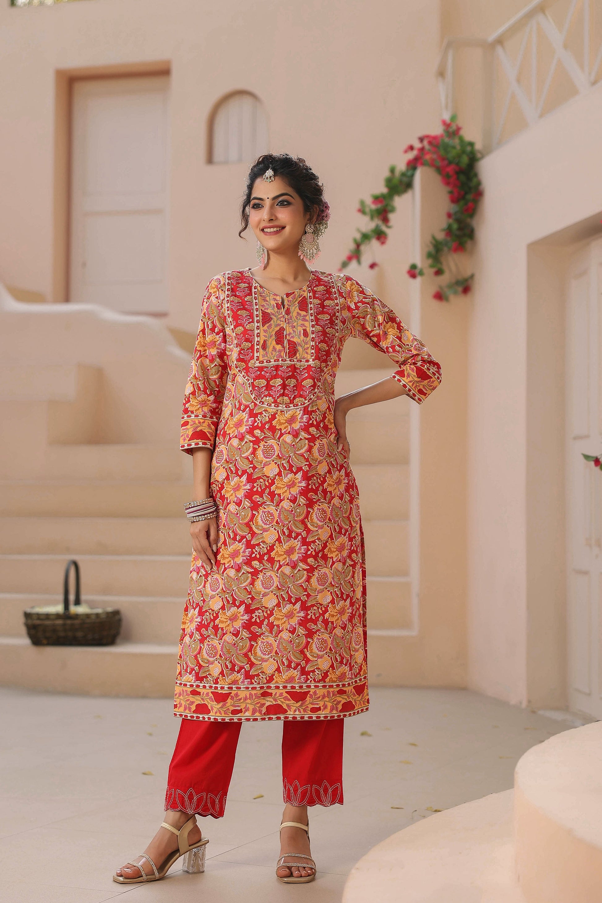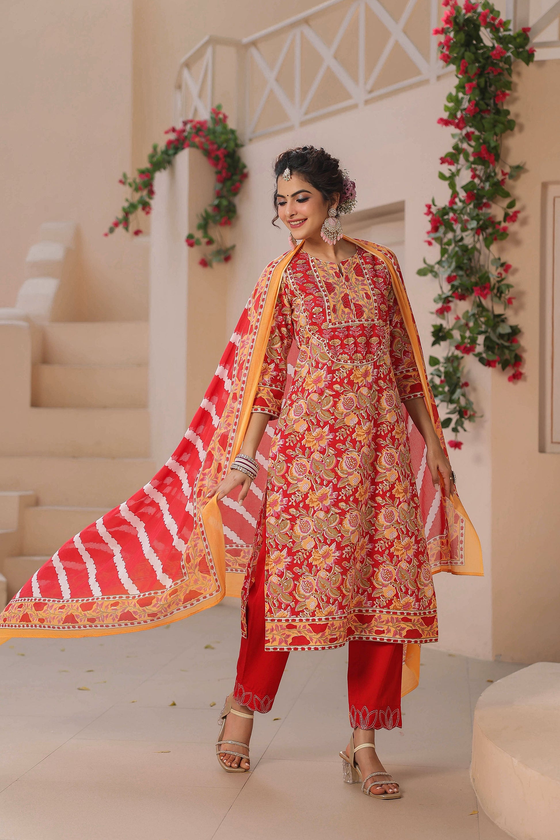 This is a red ethnic motifs printed cotton kurta with solid trousers and printed cotton dupatta, round neck with embroidered yoke, three-quarter sleeves, calf length with straight hem, solid mid-rise trousers with partially elasticated waistband and embroidered hem, cotton printed dupatta.