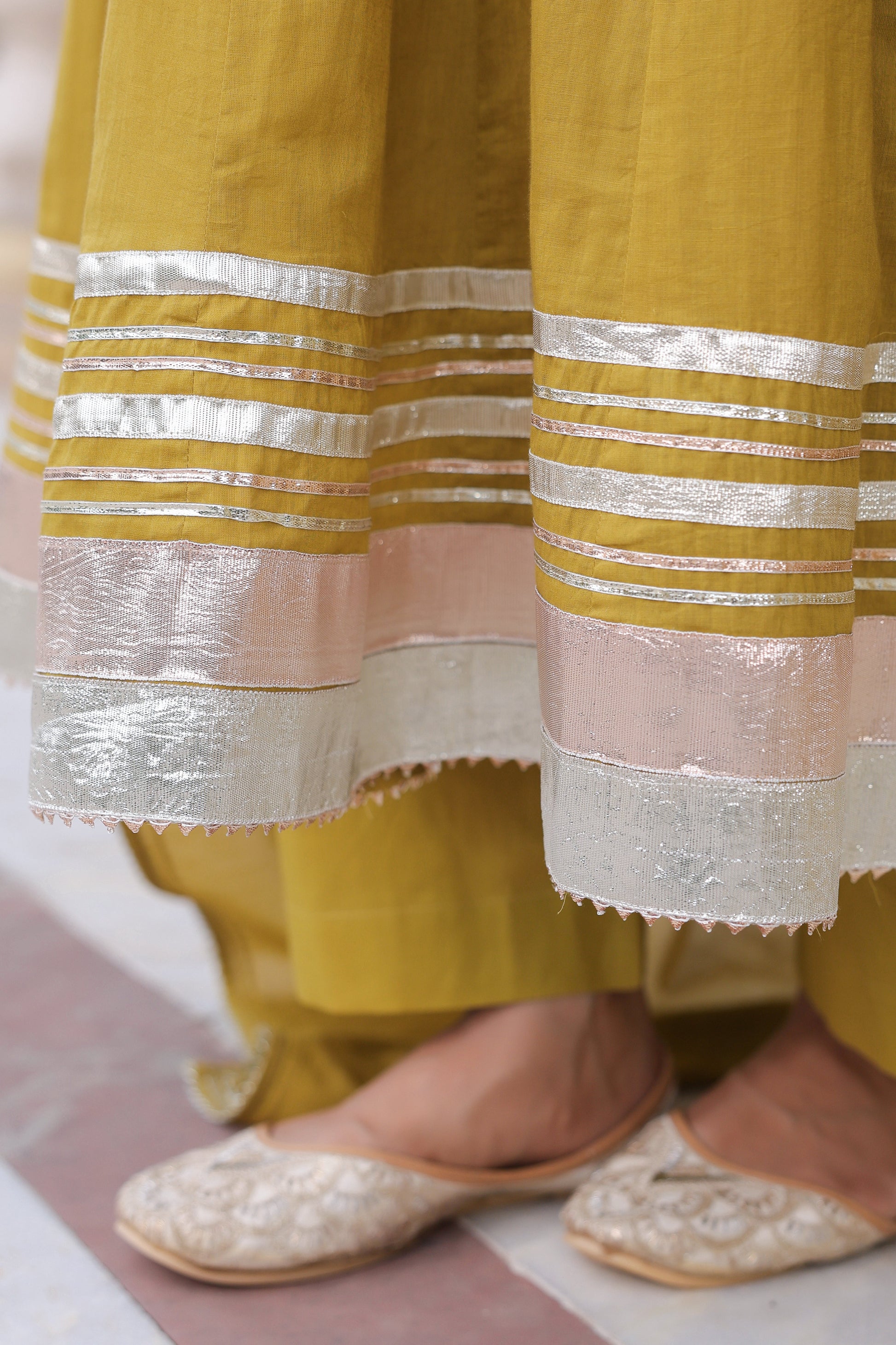 This elegant 3-piece set features a yellow Angrakha-style Anarkali kurta with a V-neckline adorned in mirror embroidery and heavy tassel detailing. The kurta comes with three-quarter sleeves enhanced with gota work for a festive touch. Paired with solid yellow mid-rise trousers featuring a comfortable slip-on closure, and a yellow dyed cotton dupatta with matching gota detailing