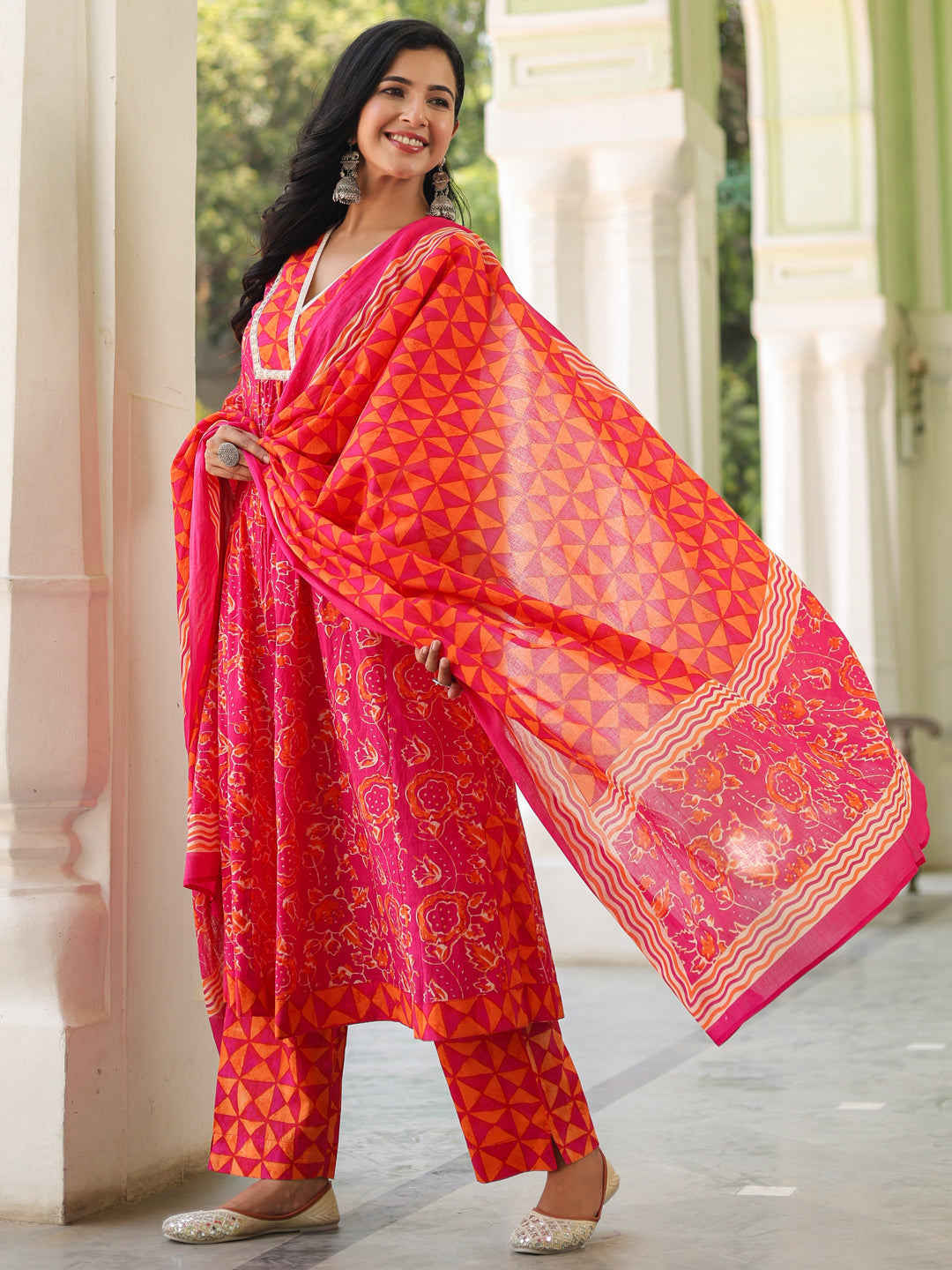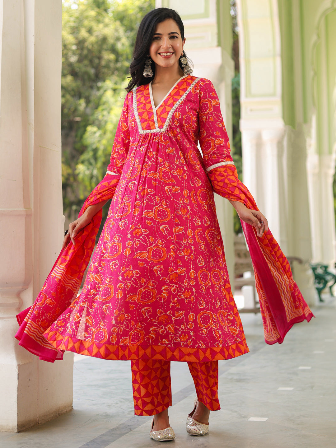This pink and orange floral printed kurta set is a vibrant and graceful ensemble, ideal for both casual and festive occasions. The A-line kurta features a flattering V-neckline with delicate lace detailing, complemented by three-quarter sleeves adorned with matching lace. Designed with side slits for added comfort, the set includes orange mid-rise printed trousers with a slip-on closure and functional pockets, and a coordinated printed cotton dupatta to complete the look.