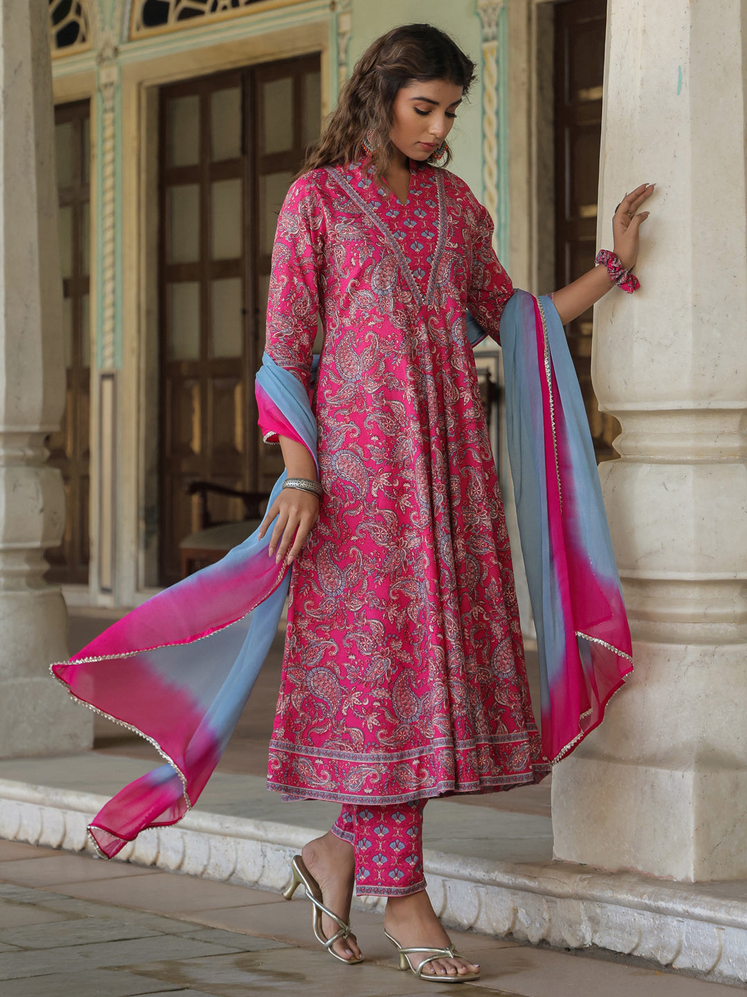 Women Fuchsia Paisley Printed Pure Cotton Kurta With Printed Trouser And Dyed Dupatta