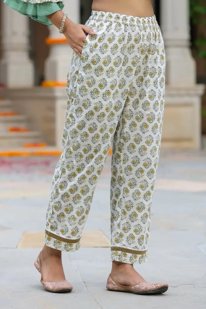 Green & beige printed kurta with trousers with dupatta, floral printed square neck anarkali kurta, three quarter bell sleeves kurta with 2 pocket, calf length with flared hem, printed trousers with elasticated waistband