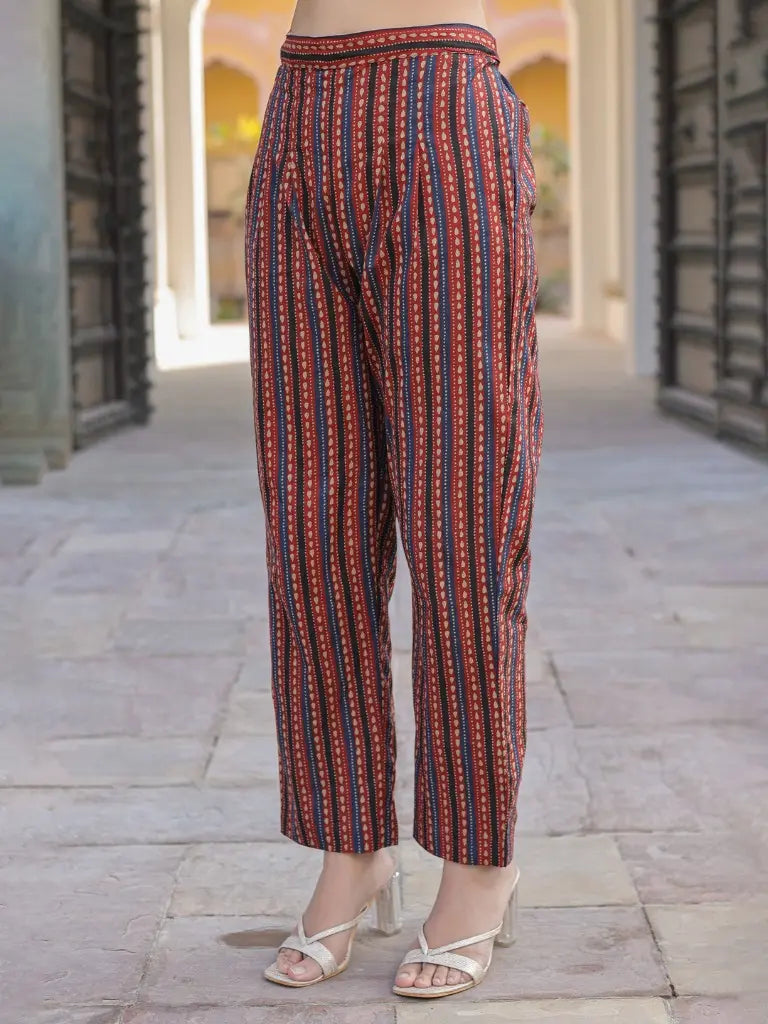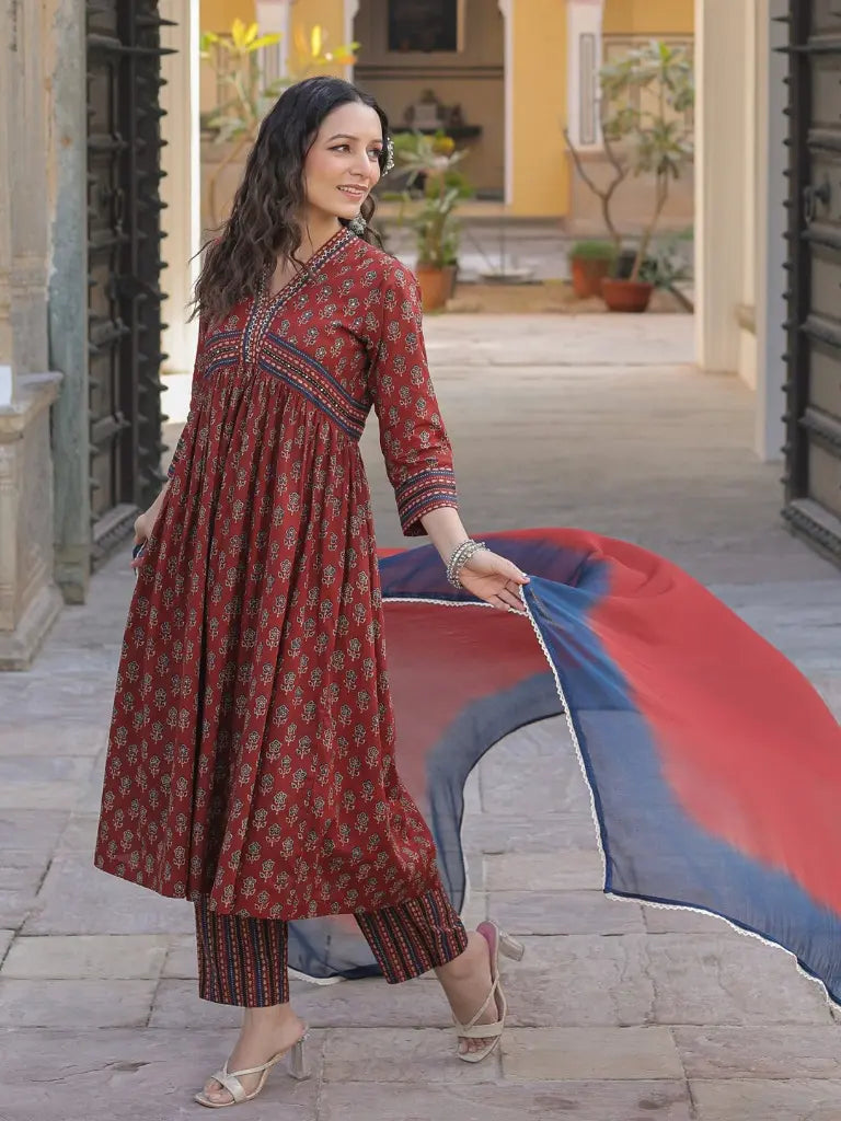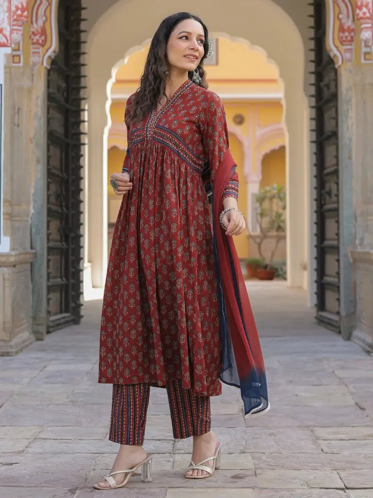 Women Maroon Ethnic Motifs Printed Empire Design Anarkali Kurta With Printed Trouser & Dupatta