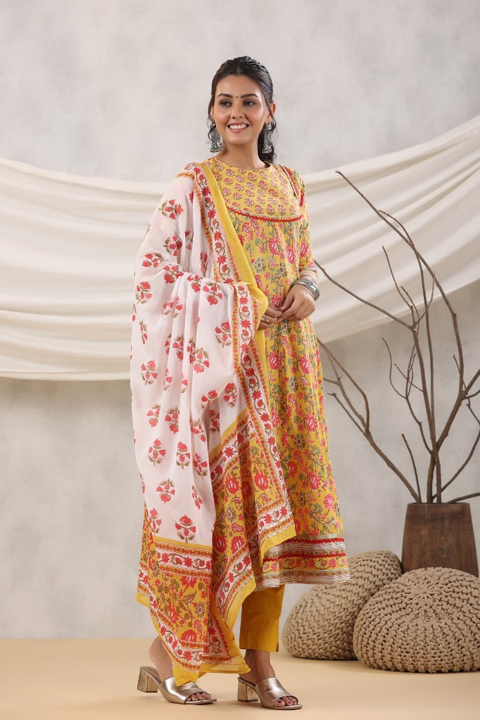 This is a mustard yellow floral printed kurta with solid trousers and printed cotton dupatta, round neck anarkali kurta with sequinned detail, panelled style kurta with three-quarter regular sleeves, calf length kurta with flared hem, solid trousers with elasticated waistband and drawstring closure.