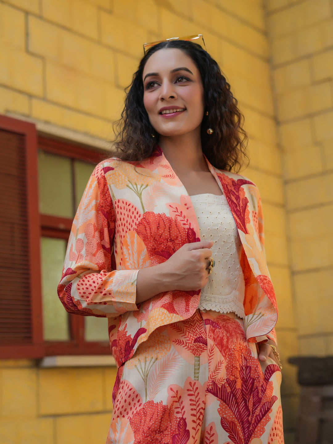 This co-ord set includes a top, trousers, and a jacket. The white self-design Schiffli top features shoulder straps, a sleeveless design, a round neck, a scalloped hem, and a slip-on closure. The peach and orange floral-printed jacket has a V-neck, long sleeves, a full placket, a regular waist hem, and a front-open style. The peach and orange floral-printed trousers are mid-rise with a button closure, flared hem, and two pockets.