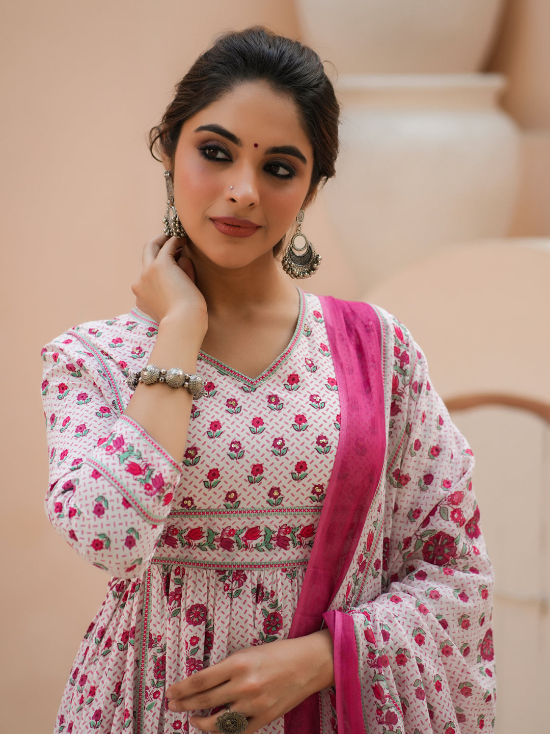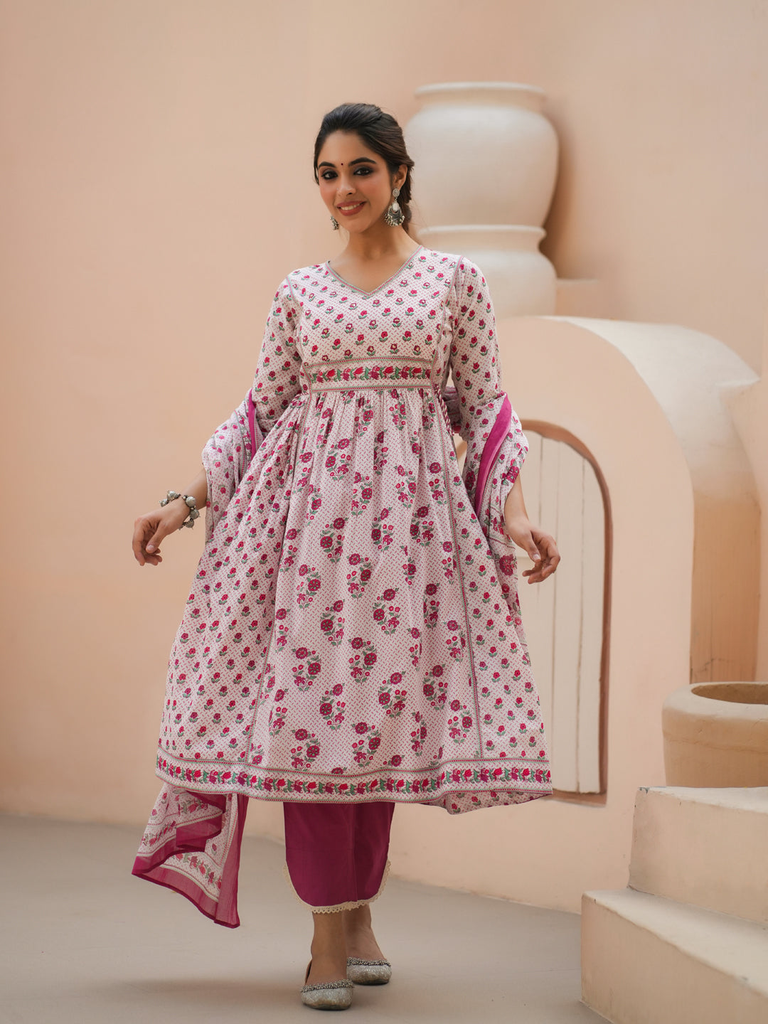 Women Pink Floral Printed Pure Cotton A-line Kurta With Solid Trouser And With Printed Dupatta
