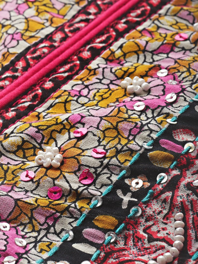 This is a pink mix and match print anarkali kurta, round neck kurta with tie-up detail at waist, three-quarter regular sleeves kurta, calf length kurta with flared hem.