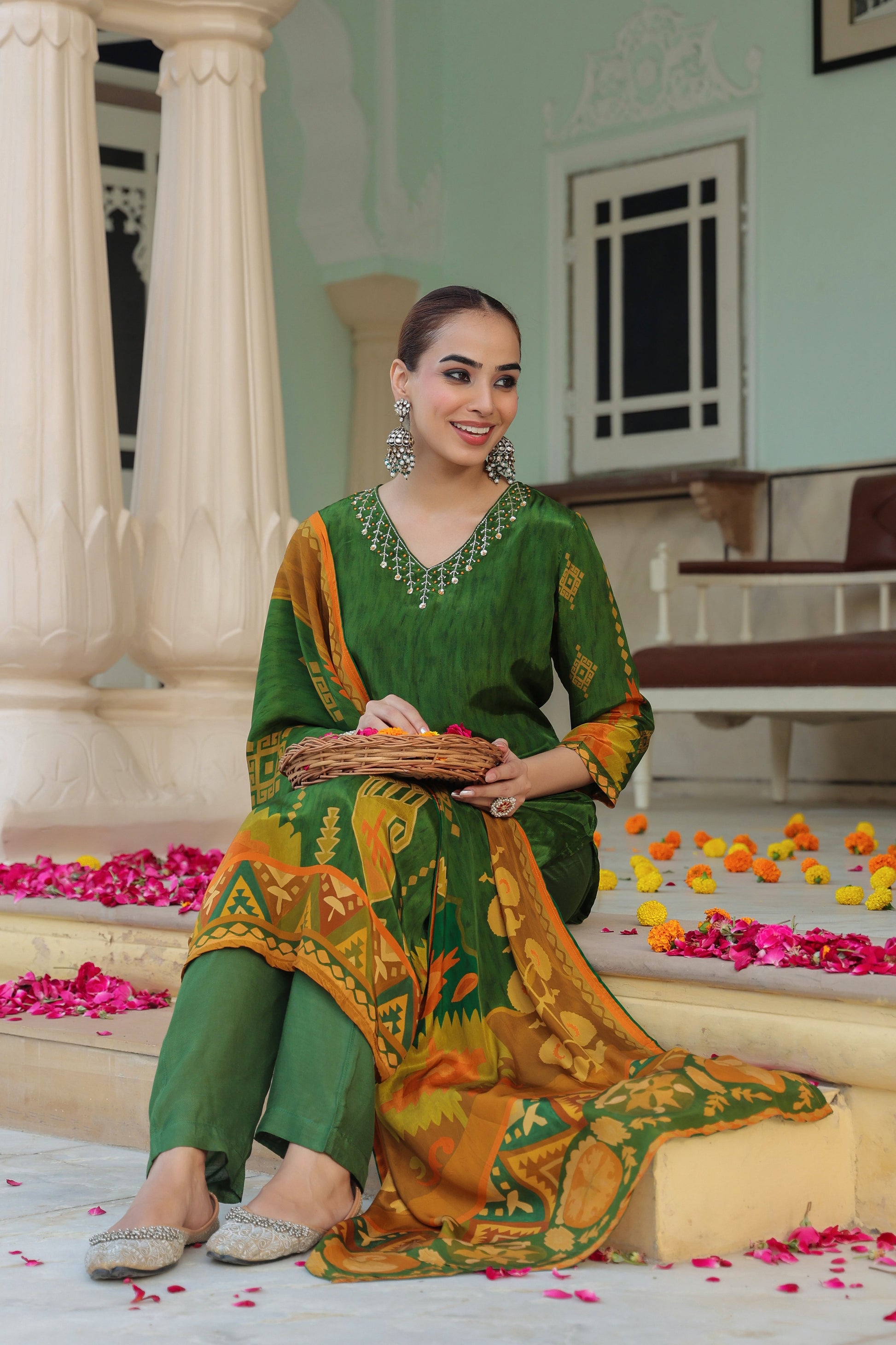 Grace your wardrobe with this green ethnic motifs printed kurta set, featuring a V-neck kurta with gota patti detailing, three-quarter sleeves, and a straight fit. Paired with solid green mid-rise trousers with a slip-on closure and a digitally printed muslin dupatta, this set blends tradition with modern elegance.