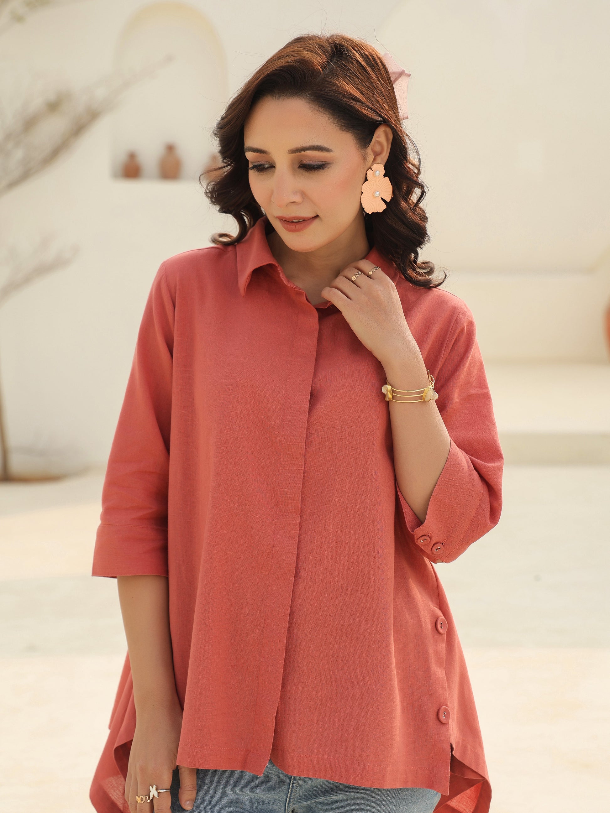 This is a peach solid cotton shirt, collared shirt with button closure, three quarter sleeves with cuff detail, high low shirt with button detail on sides.
