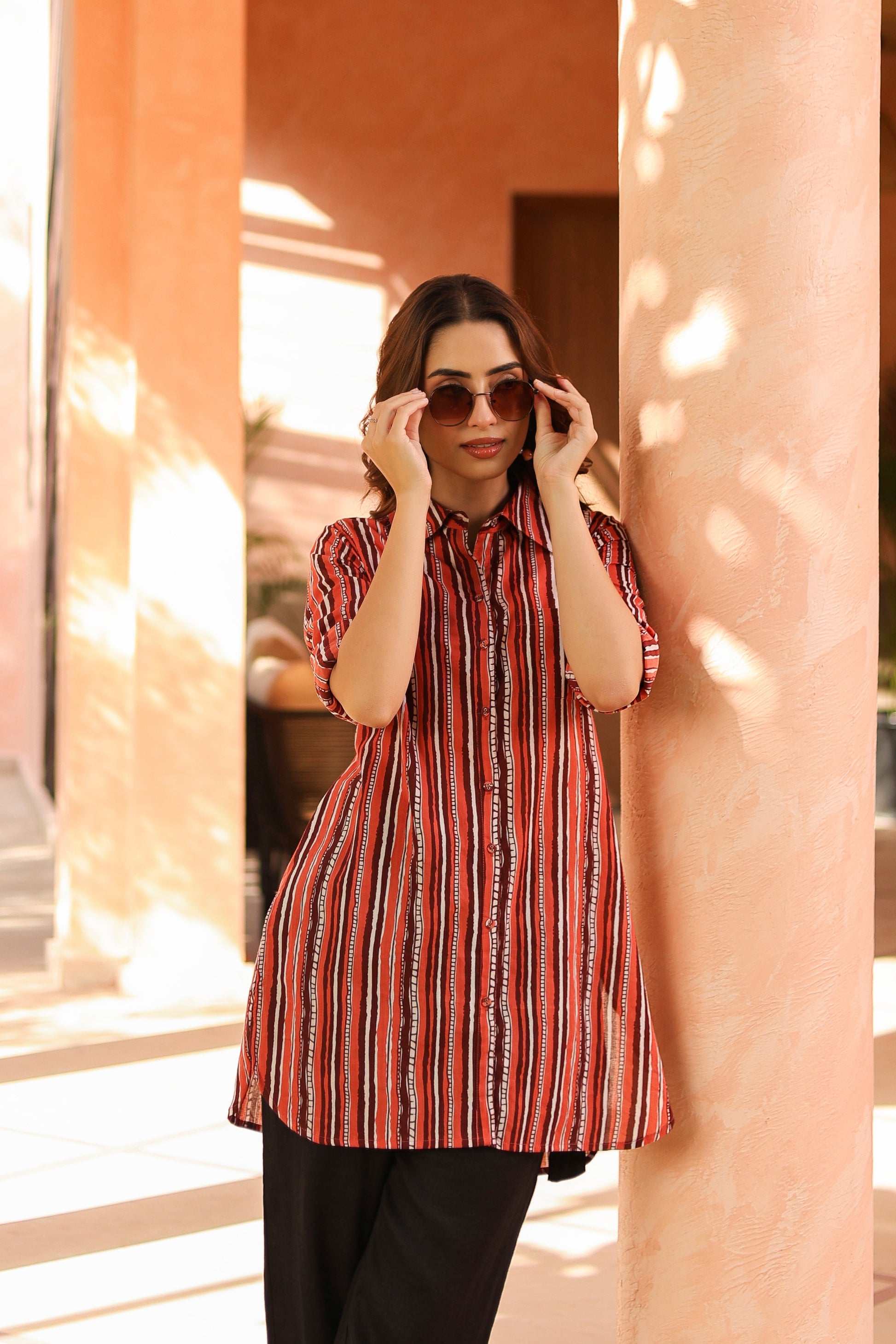 This is a brown striped longline shirt, collared shirt with button closure, long length sleeves with cuff.
