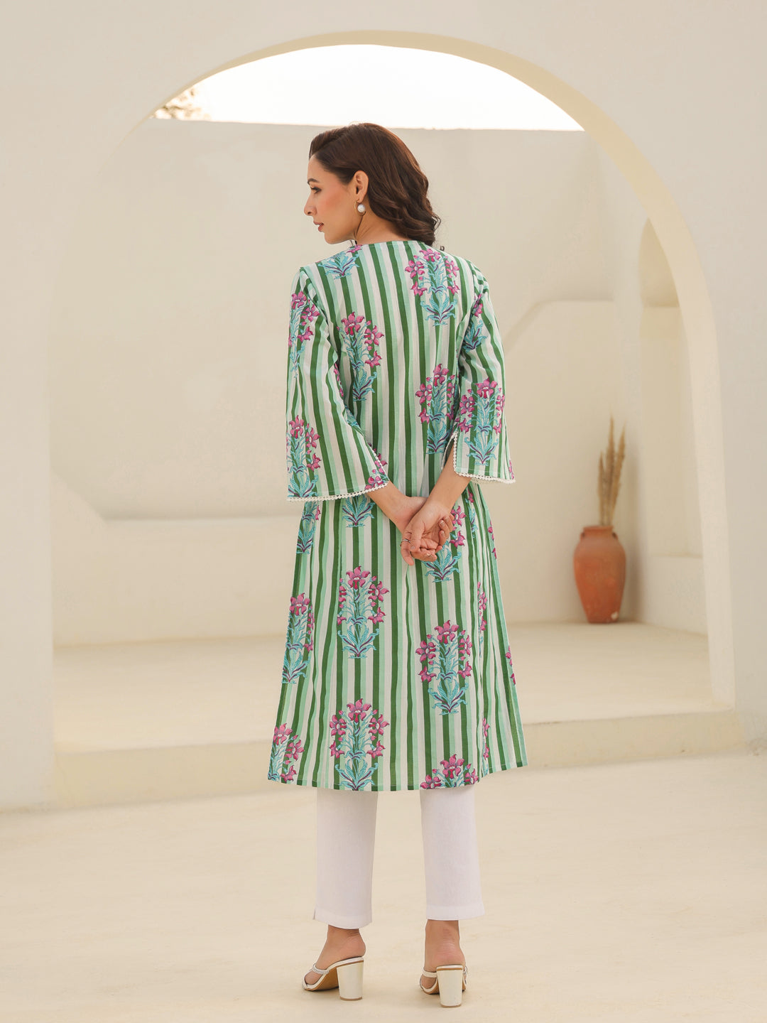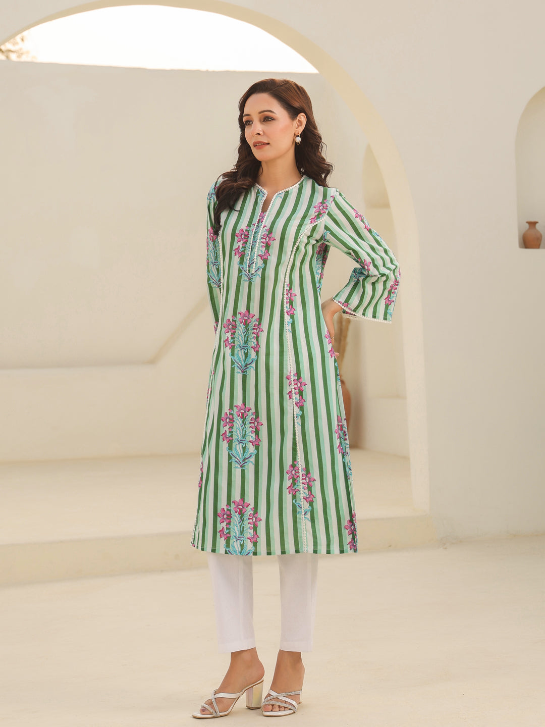 This is a green and white stripe with floral printed kurta, round neck kurta with lace detail, three-quarter sleeves with slit detail, A-line kurta with side slits.