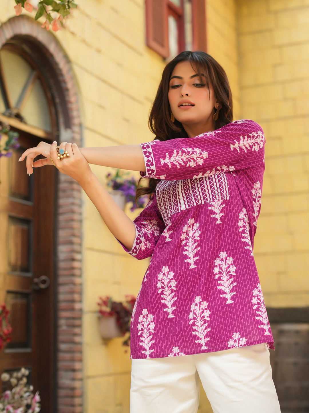 This is a wine and white straight kurti, ethnic motifs printed round neck kurti with sequined detail, three-quarter regular sleeves kurti.